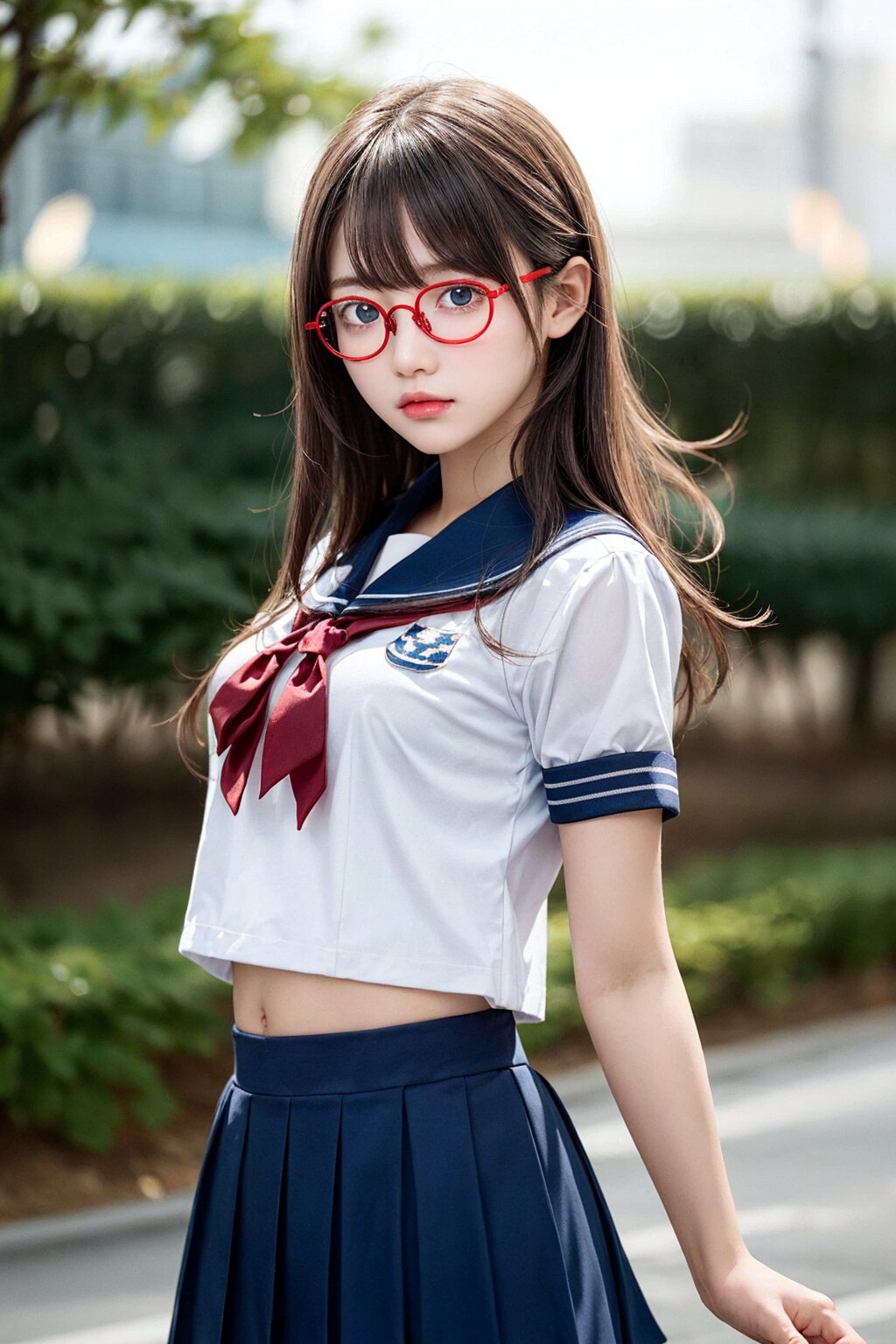 (ultra quality), ultla highres, HD 16k, hyper detailed, amazing shading, high contrast, raw photo, perfect anatomy, perfect proportion, perfect face, perfect hands, perfect legs, (beautiful fingers, perfect fingers, five fingers, detail fingers), beautiful nails, beautiful lips, (a professional photo of japanese girl), detailed facial features, detailed clothes features, depth of field, physically-based rendering, professional lighting, reflect light, (sharp focus, bokeh:1.41), 1girl, 16-years-old, cute, little girl, slim, slender, pat shoulders, baby face, tall, shiny skin, flawless smooth skin, (small breasts, beautiful breasts), (navel:1.31), without makeup, BREAK very long hair, blunt bangs, black hair, shiny hair, wavy hair, BREAK (catchlight, symmetrical eyes, glowing eyes, bright eyes, (blue:1.21) eyes), drooping eyes, tear bag, BREAK ((red:1.31) frame glasses, rim glasses:1.41), red ribbon:1.51, BREAK (school uniform, sailor suit, short sleeve:1.21), BREAK looking at viewer:1.71, upper body, (nice angle, cowboy shot, angle from front), expressionless, nose blush, outdoors, in the park, leaves and plant in front:1.41, (blue sky:1.11, sunshine1.21), <lora:flat2:-0.7> <lora:koreandolllikenessV20_v20:0.1> <lora:taiwandolllikenessV20_v20:0.1> <lora:japanesedolllikenessV1_v15:0.4>