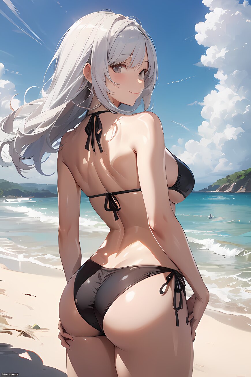1 lady, silver hair, long hair, (back) (bikini), beach, cowboy shot, seductive smile, ,Art Style 2.0,shiny skin