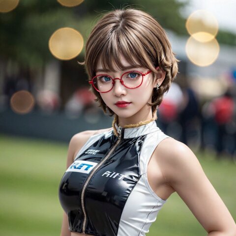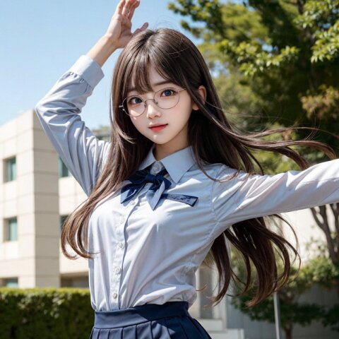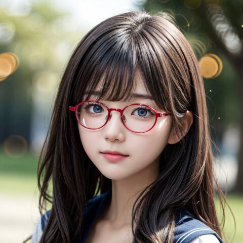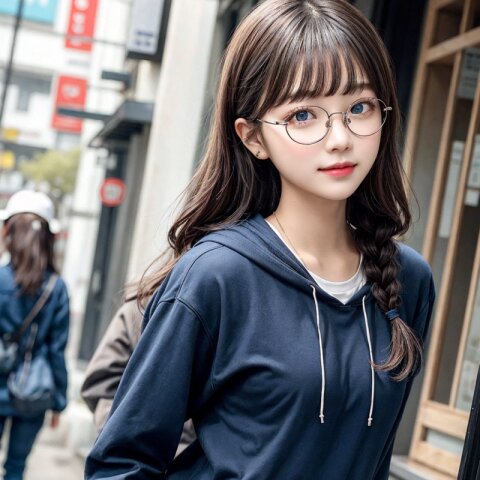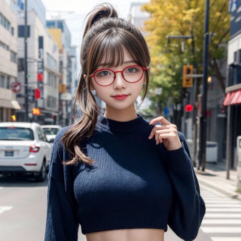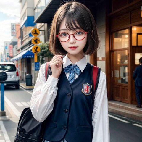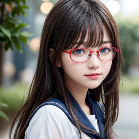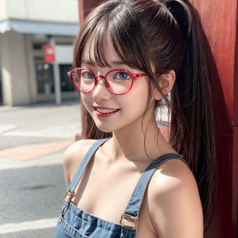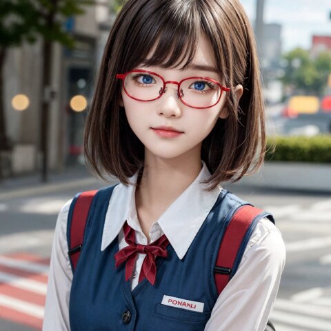 (masterpiece:1.3), (ultra quality), ultla highres, HD 16k, hyper detailed, intricate detailed, amazing shading, high contrast, raw photo, super fine illustration, perfect anatomy, perfect proportion, perfect face, perfect hands, perfect legs, (beautiful fingers, perfect fingers, five fingers, detail fingers), beautiful nails, beautiful lips, (a professional photo of japanese girl), detailed facial features, detailed clothes features, depth of field, physically-based rendering, professional lighting, back light, (sharp focus, bokeh:1.31), BREAK cute, girly, 1girl, (15-years-old), little girl, slim, slender, petite, short, shiny skin, medium breasts, baby face, eyeliner, eyelashes, makeup, jewelry, earrings, necklace, bracelet, BREAK (low bun), short hair, brown hair, shiny hair, BREAK (catchlight, symmetrical eyes, glowing eyes, bright eyes, (blue:1.31) eyes), drooping eyes, tear bag, BREAK ((red:1.41) frame glasses, rim glasses:1.31), BREAK oversized very long hem (white:1.81) t-shirt:1.51, short sleeve, denim pants, belt, shoulder bag, strap between breasts, paisura, BREAK looking at viewer:1.71, (full body, angle front), smile:1.71, nose blush:1.21, standing, outdoors, street scenery, light clouds, blue sky, daytime, <lora:flat2:-0.7> <lora:koreandolllikenessV20_v20:0.1> <lora:taiwandolllikenessV20_v20:0.1> <lora:japanesedolllikenessV1_v15:0.4> <lora:paisura:1.0>