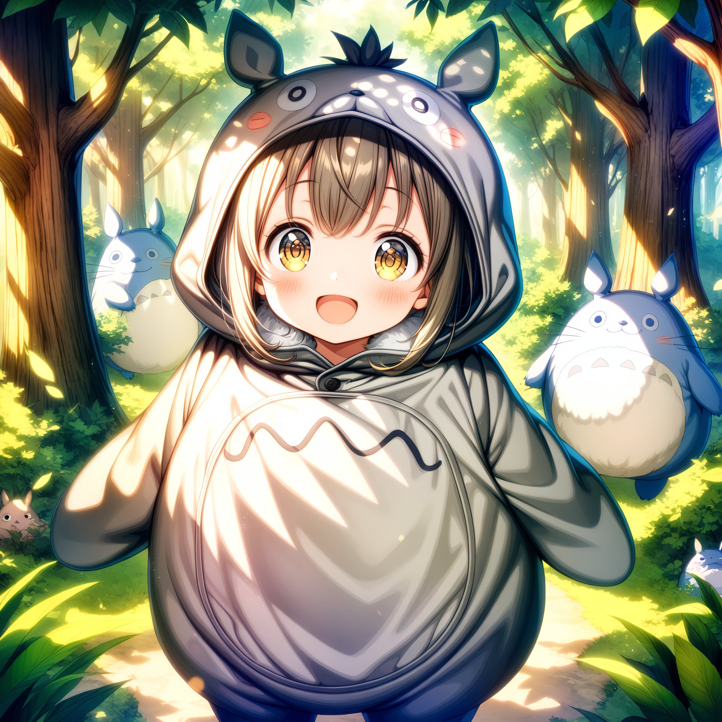 (8k),(wall paper),(very aesthetic:1.4), (recent:1.2),{"adorable girl in Totoro cosplay, fluffy grey costume, big expressive eyes, playful smile, standing in a lush green forest, surrounded by magical creatures, soft sunlight filtering through the trees, cute and whimsical atmosphere"} <lora:sdxl2-flat2-512b:-1> <lora:DetailedEyes_V3:2>