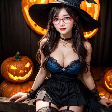 (ultra quality), ultla highres, HD 16k, hyper detailed, amazing shading, high contrast, raw photo, perfect anatomy, perfect proportion, perfect face, perfect hands, perfect legs, (beautiful fingers, perfect fingers, five fingers, detail fingers), beautiful nails, beautiful lips, (a professional photo of japanese girl), detailed facial features, detailed clothes features, depth of field, physically-based rendering, professional lighting, reflect light, (sharp focus, bokeh:1.31), 1girl, 18-years-old, cute, little girl, slim, slender, pat shoulders, baby face, tall, shiny skin, flawless smooth skin, (medium breasts, beautiful breasts), eyeliner, eyelashes, (eye bag, heavy eye makeup), (heavy makeup:1.31), (gothic makeup:1.21), narrow waist, large pelvis, wide hips, emphasize cleavage, shoulder, collarbone, BREAK long hair, blunt bangs, black hair, shiny hair, wavy hair, BREAK (catchlight, symmetrical eyes, glowing eyes, bright eyes, (blue:1.31) eyes), drooping eyes, tear bag, BREAK ((red:1.41) frame glasses, rim glasses:1.41), BREAK (gorgeous embellished pumpkin halloween costume:1.41), arm cover, lantern sleeves, gothic lolita dress with frills and lace details, strapless, ((black) pannier with 3 layers under long skirt:1.41), witch hat, Jack-o-lantern in witch's hat:1.21, BREAK (black thighhighs), garter belt, (choker with cross pendant that hangs over her chest), BREAK looking at viewer:1.71, above thighs, (nice angle, cowboy shot, angle from below), (laugh:1.41, smiling:1.51, blushing face:1.21), sitting naturally, indoors, halloween cosplay parade a night, (halloween:1.21), jack-o-lantern, <lora:flat2:-0.7> <lora:koreandolllikenessV20_v20:0.1> <lora:taiwandolllikenessV20_v20:0.1> <lora:japanesedolllikenessV1_v15:0.4>