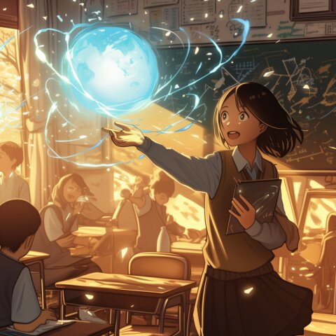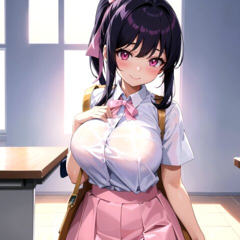 masterpiece, super fine illustration, best quality, ultra-detailed, 8K wallpaper, (a little girl),(big breasts:1.2),(black hair),(long hair),(ponytail),((black skirts)),((white school uniform),smile,classroom