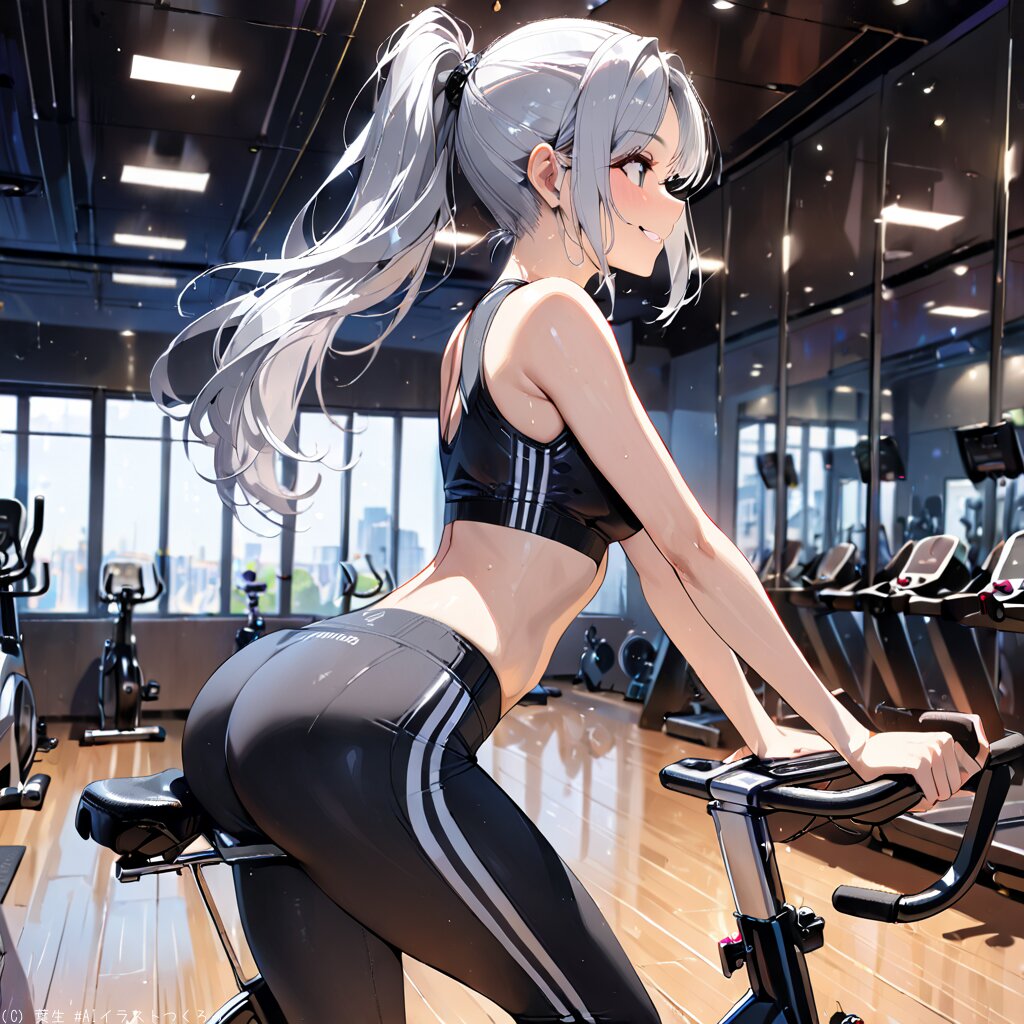 (best quality),(masterpiece),(ultra detailed),1 lady, long ponytail, silver hair, smile, black sportswear, cool, navel, leggings, side view, looking away, gym, exercise bike