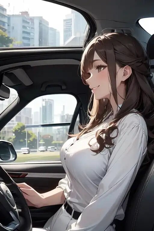 1 lady, long hair, wavy hair, brown hair, (big breasts), white blouse, black pants, (car interior), ((driving car)), side view, cowboy shot, smilelora:more_details:0.5>,Art Style 2.0