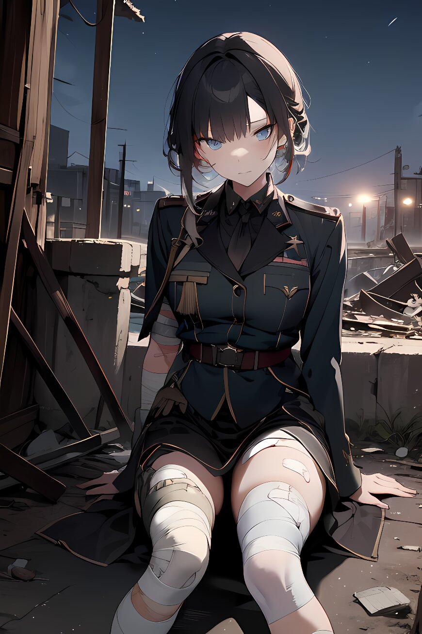 1 lady, ((military uniform, injured)), bandage, night, ruins, sitting, rifle ,Art Style 2.0