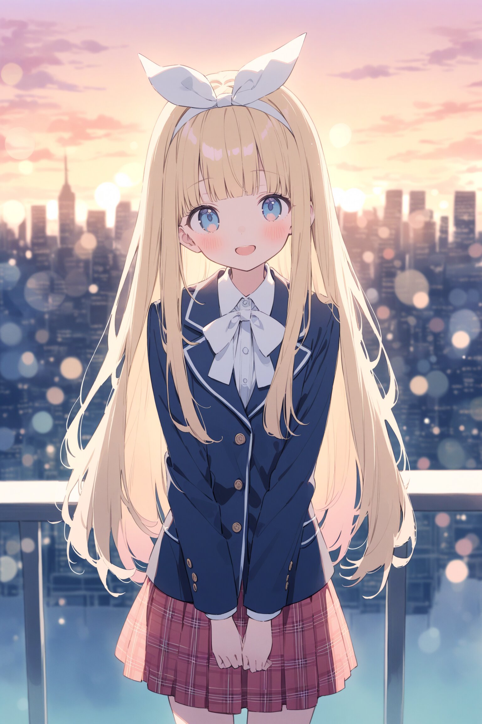 watercolor \(medium\),(pastelcolor:0.4),(sketch:0.4),1girl,blonde hair,straight long hair,blunt bangs,white ribbon hairband,blue eyes,blush,open mouth smile,navy blue blazer,red plaid skirt,head tilt,v-arms,pastel hues,blurred edges,nostalgic mood,terrace,optical flare,bokeh,front view,blurry,(depth of field:1.2),straight-on,blurry sunset view,cityscape