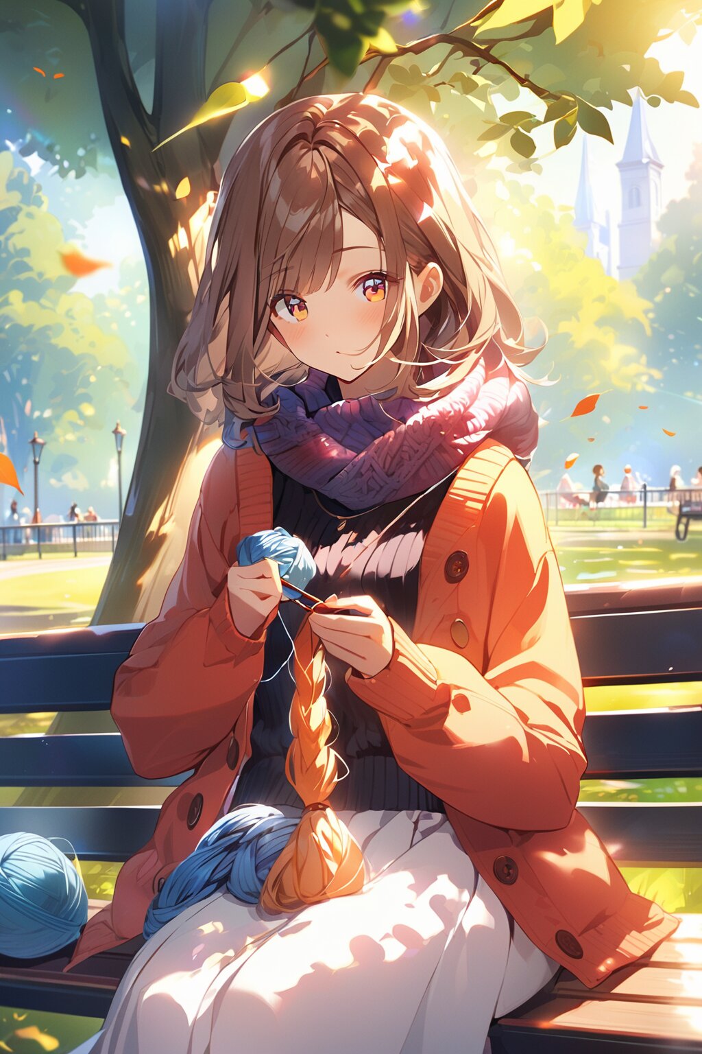 1 lady, (knitting), sitting on bench, park, sunlight from tree