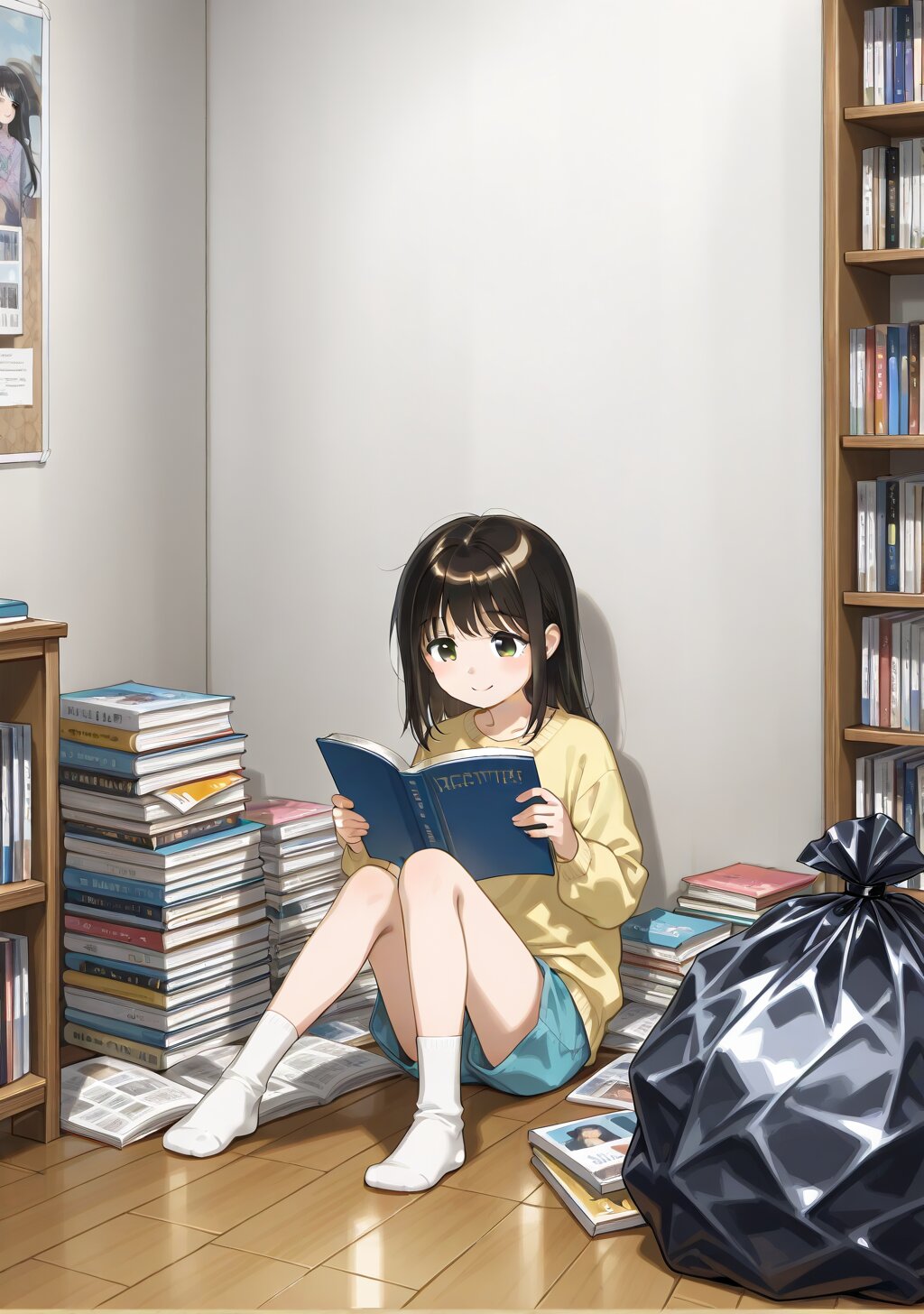 beautiful room, A slightly messy room, A book packed with books, an empty bookshelf, a girl reading a book, girl focus, Laughter, sitting, smile, Garbage bag, In the middle of cleaning, the room is a little tidy. Tidy floors, flooring,
