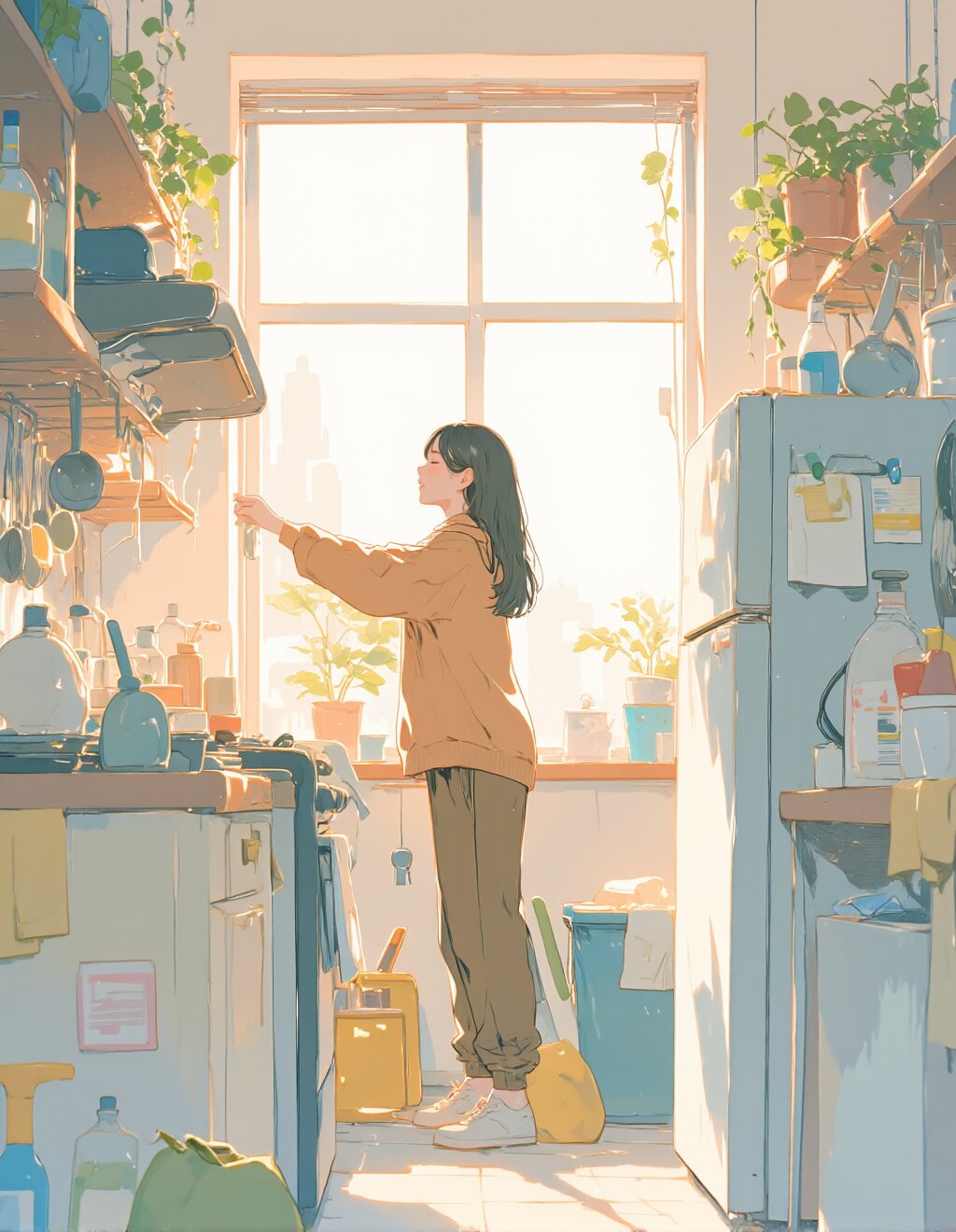 A minimalist illustration with thin outlines,flat coloring,and a softly toned yet detailed background,creating a casual and realistic atmosphere., (masterpiece),((high quality)),super details,illustration, see-through,(((soft textures))), In a kitchen,a woman is tidying up and wiping down the shelves. She is dressed in a warm sweater and comfortable pants,working with a slight smile. The background features an organized dish rack and kitchen tools,with cleaning supplies and a trash bag placed on the floor. Gentle winter sunlight streams through the window,softly illuminating the room.,