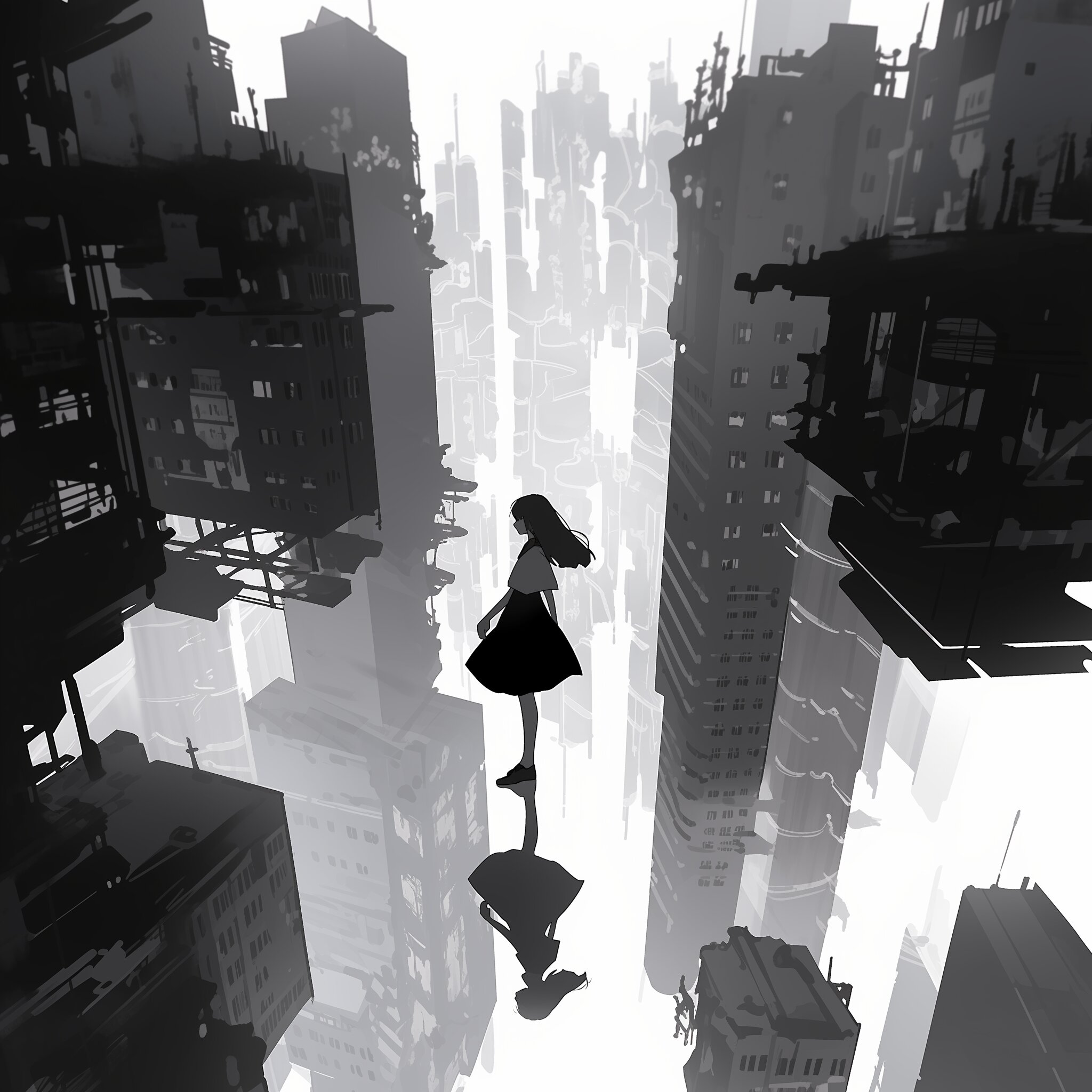 白黒の背景 未来都市 高層ビル群 街を歩く少女 黒い影 シルエット 浮遊物 2面性