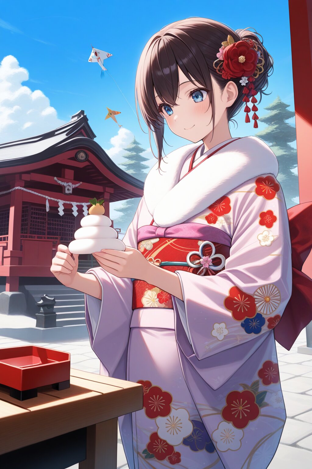 masterpiece, best quality, 1girl, kimono, New Year's mochi, shinto shrine, blue sky, kite, smile,