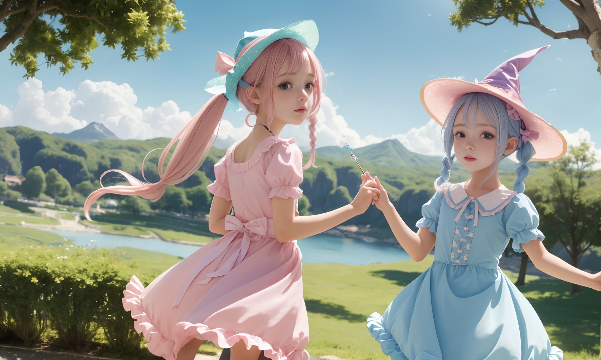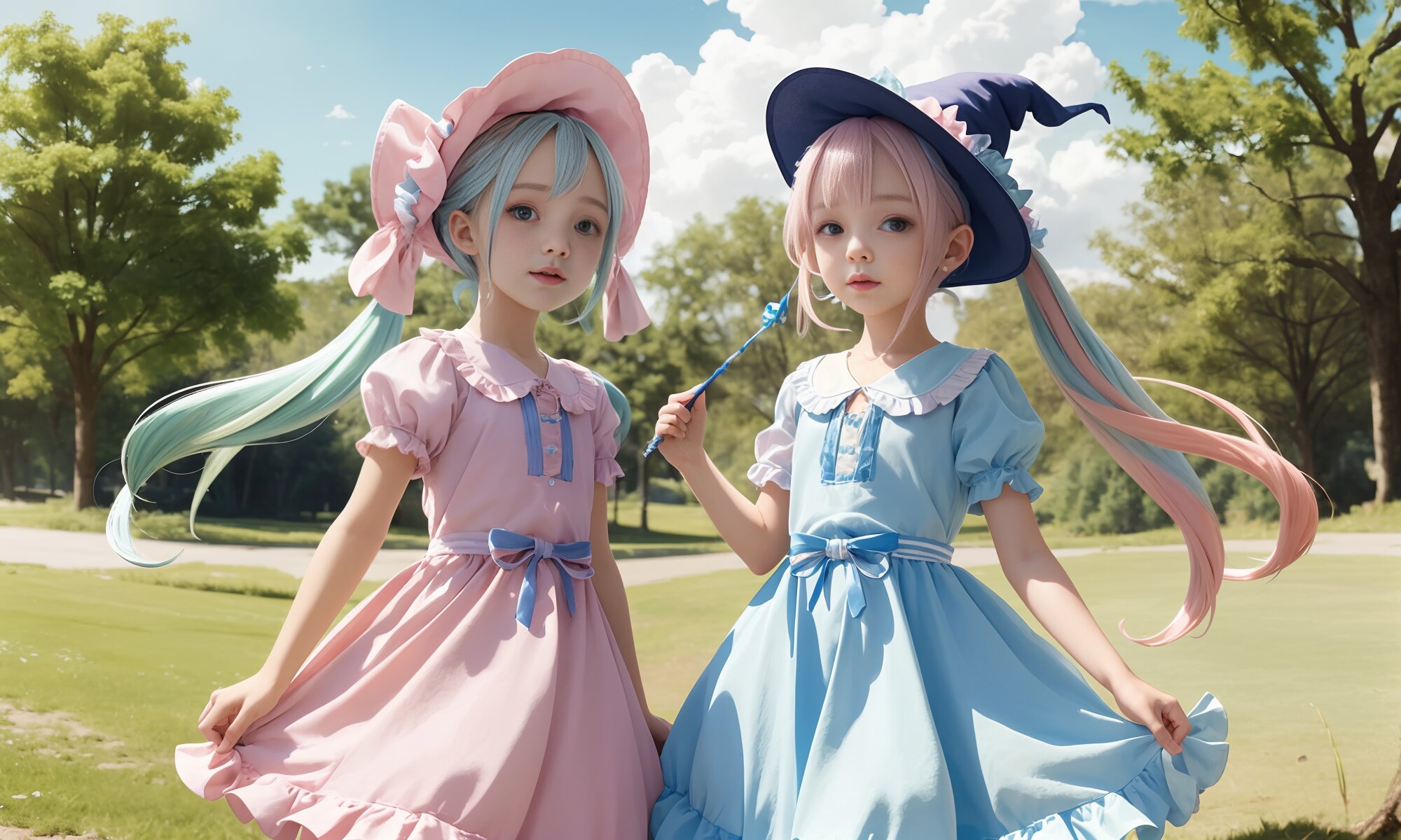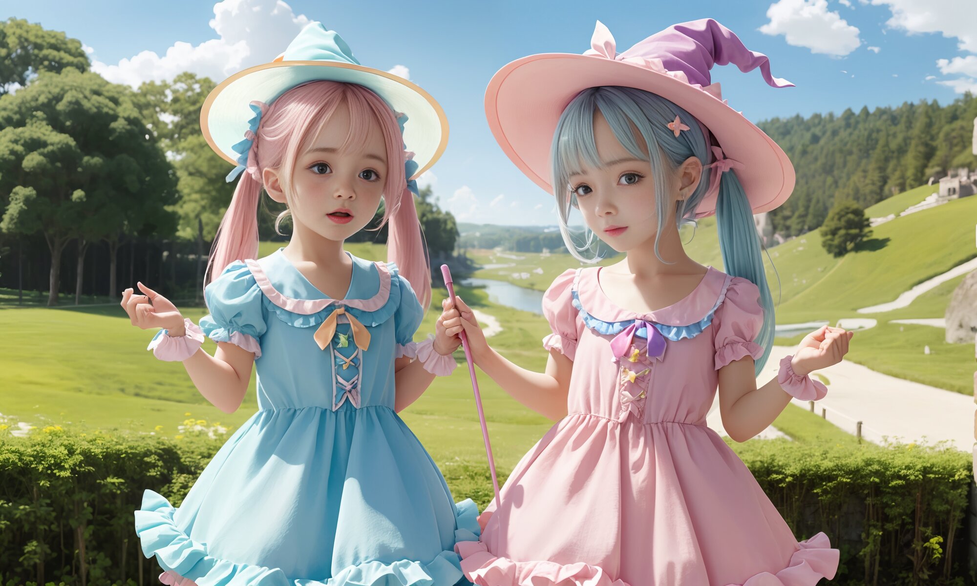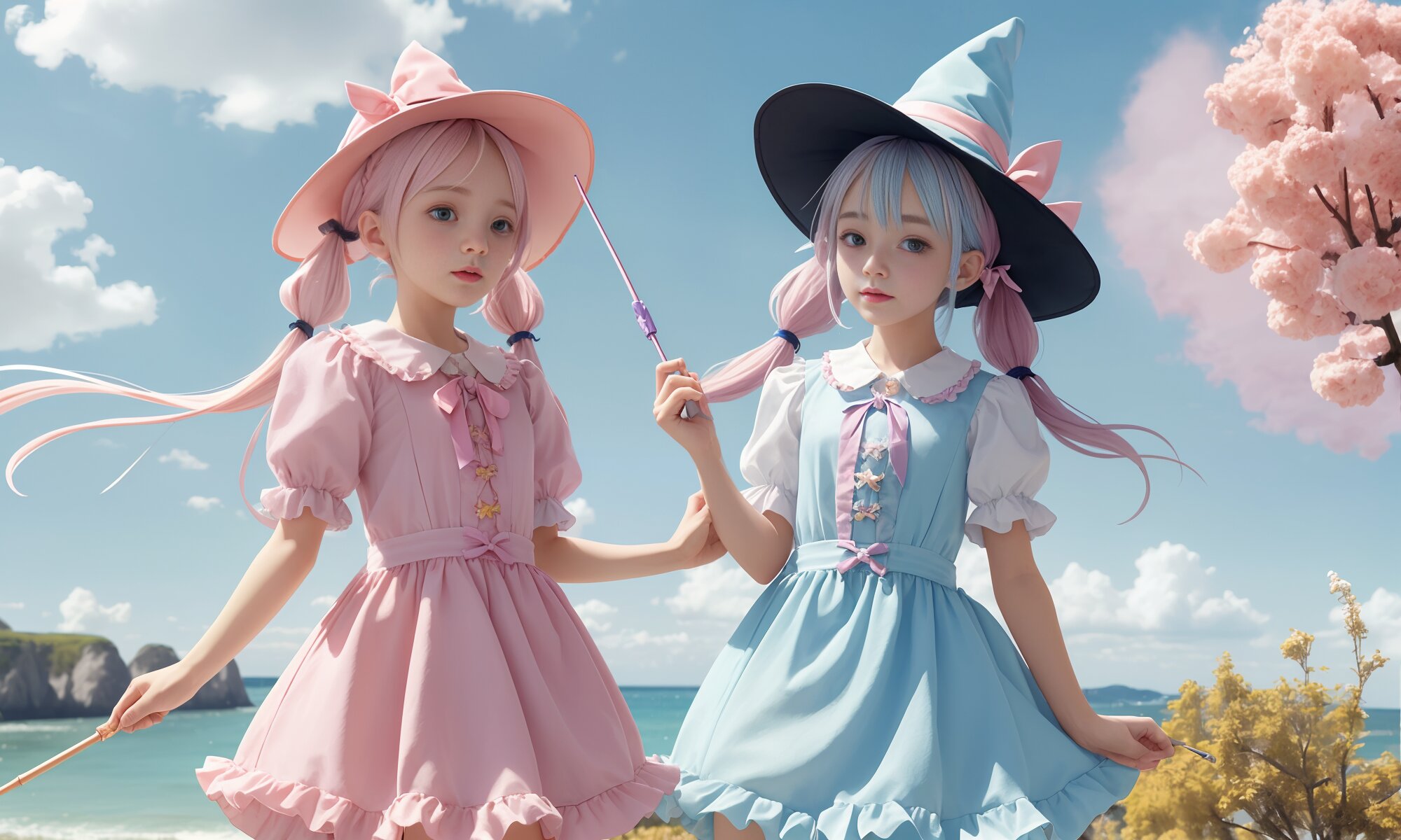 (2 little witches flying sky in fantasy world with magical wand), (pastel colored twin-tails hair), (pastel colored dress with ruffle ribbon hat) (ultra-detailed) (8k portrait) (masterpiece) (high quality) (photo realistic) (whole body):1.3