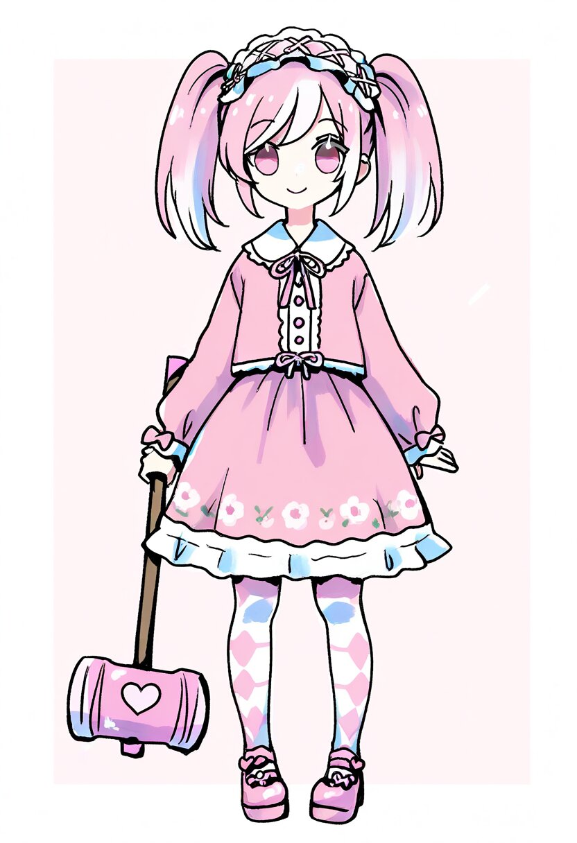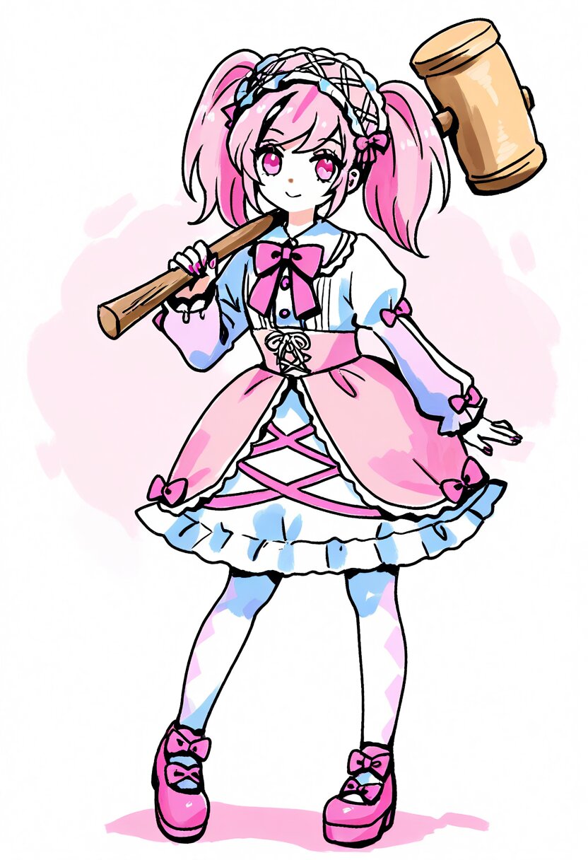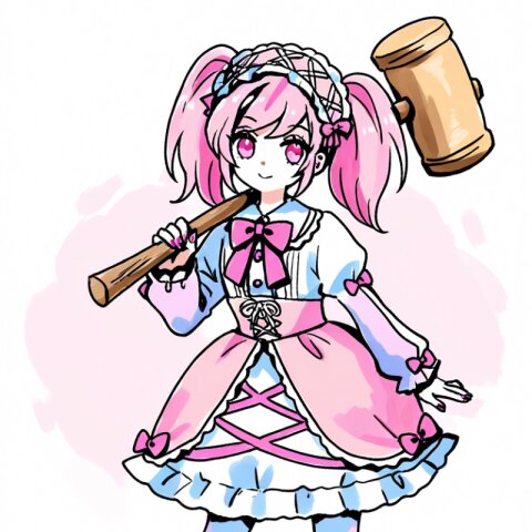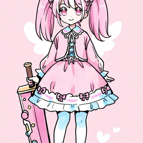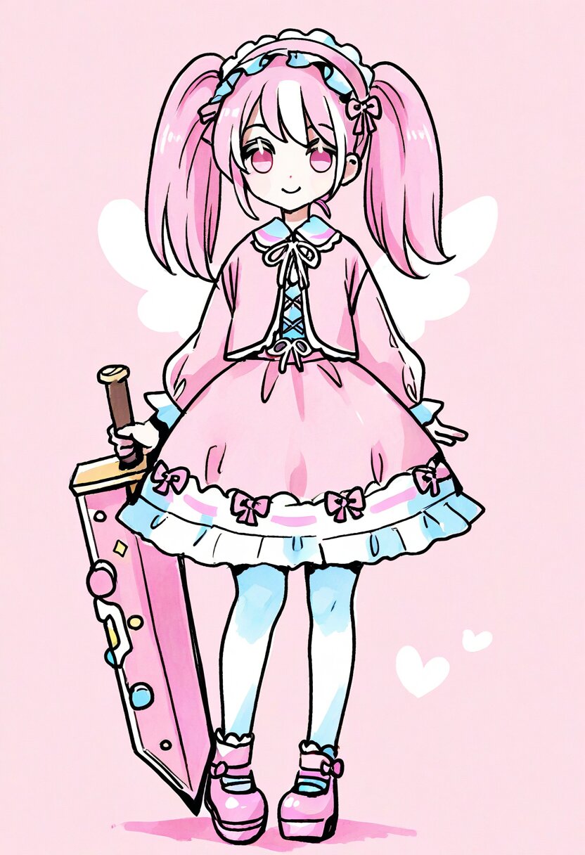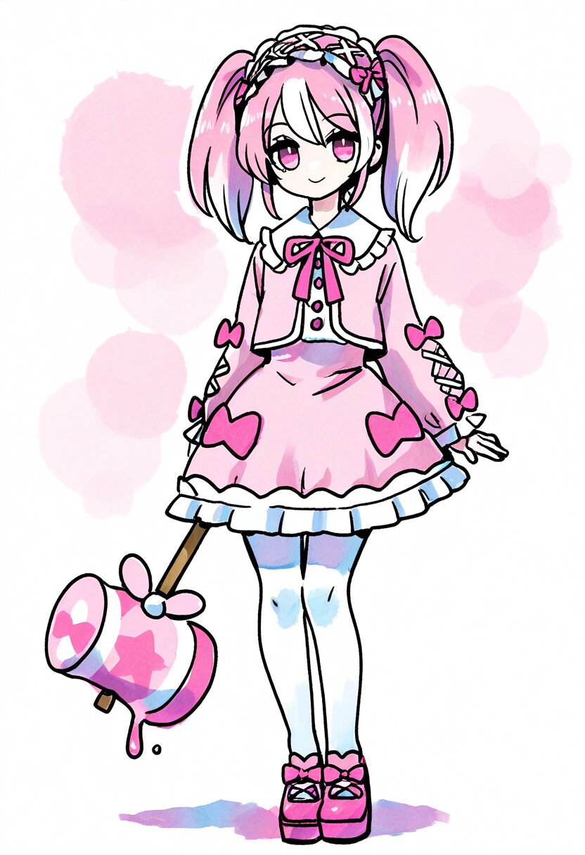<lora:inmnstyleistkmx:0.9>best quality, masterpiece, very aesthetic, general, watercolor painting, pastelcolors, cute, kawaii, 1girl, pink hair, twintails, white highlights, pink eyes, smile, sweet lolita fashion, whit tights, pink shoes, standing, holding decorative gigantic pink weapon