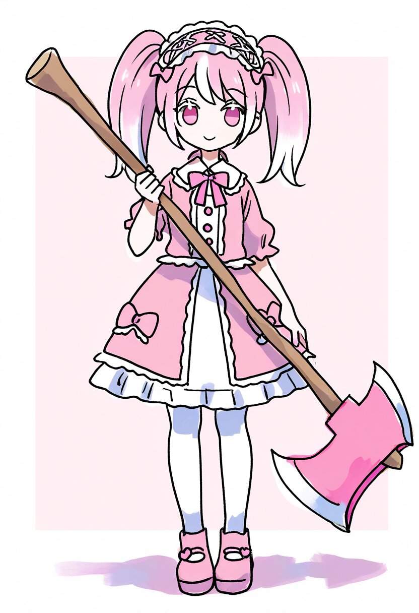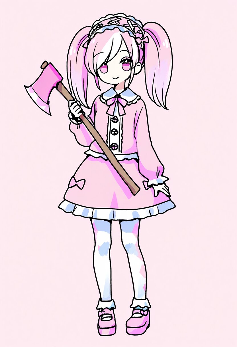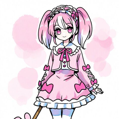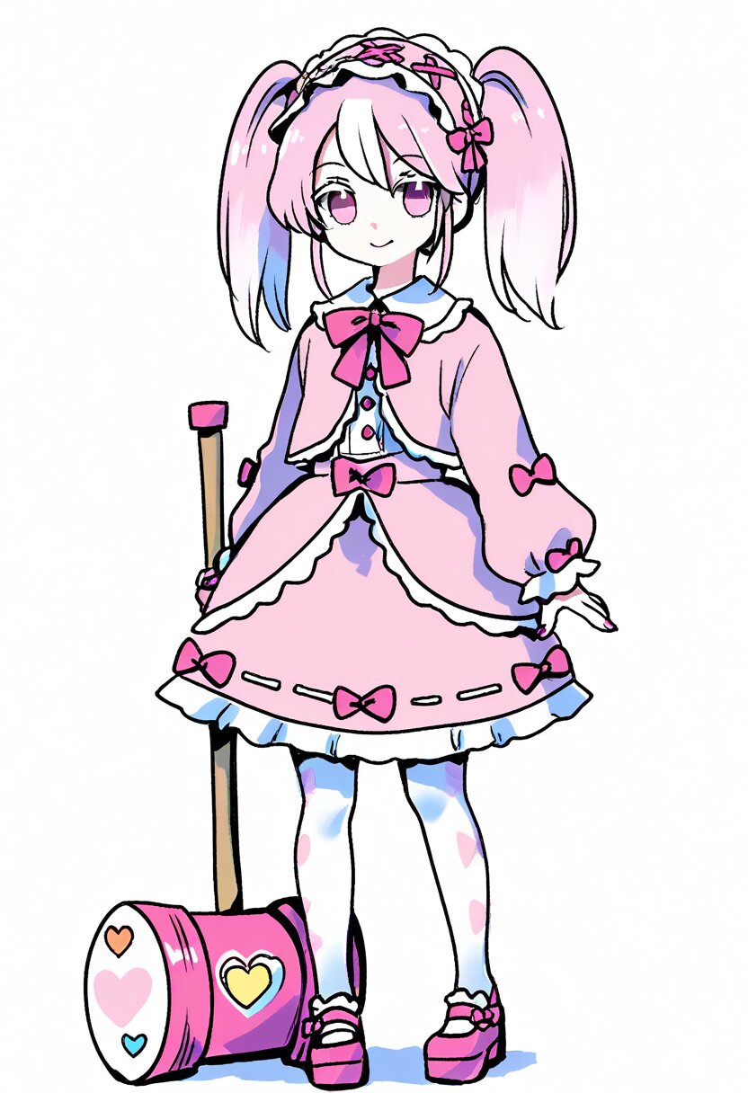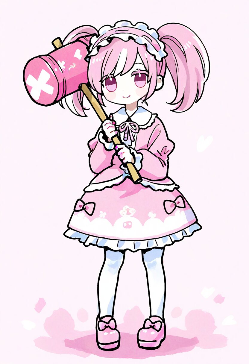 <lora:inmnstyleistkmx:0.9>best quality, masterpiece, very aesthetic, general, watercolor painting, pastelcolors, cute, kawaii, 1girl, pink hair, twintails, white highlights, pink eyes, smile, sweet lolita fashion, whit tights, pink shoes, standing, holding decorative gigantic pink weapon