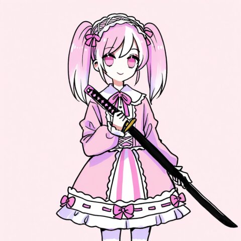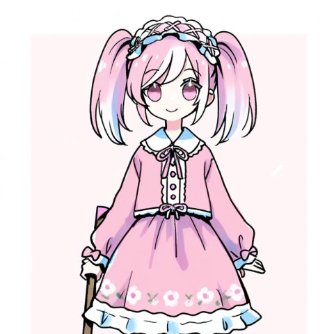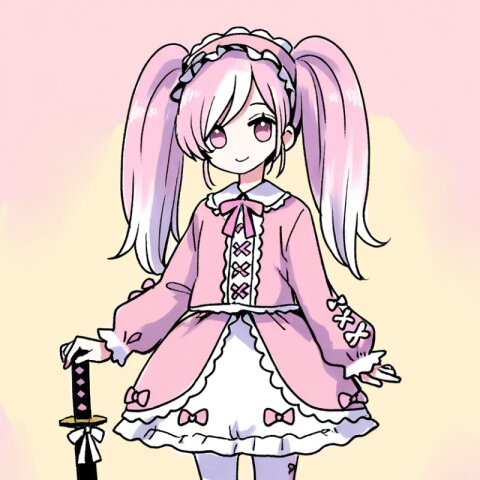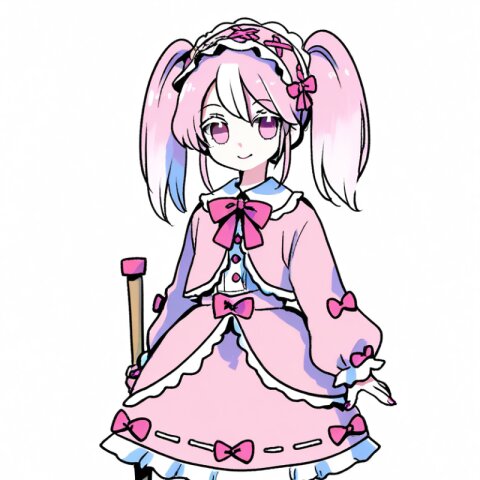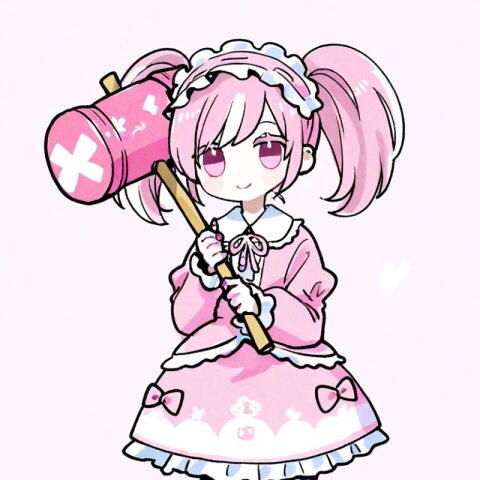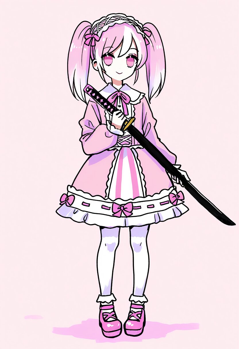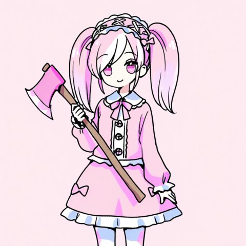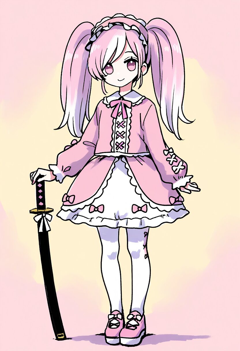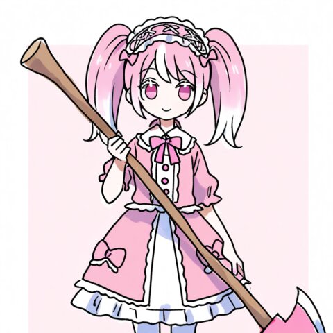 <lora:inmnstyleistkmx:0.9>best quality, masterpiece, very aesthetic, general, watercolor painting, pastelcolors, cute, kawaii, 1girl, pink hair, twintails, white highlights, pink eyes, smile, sweet lolita fashion, whit tights, pink shoes, standing, holding decorative gigantic pink weapon