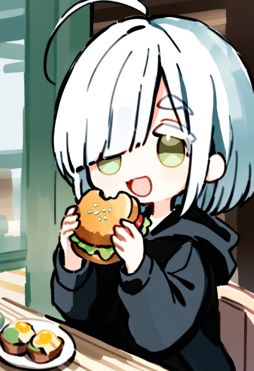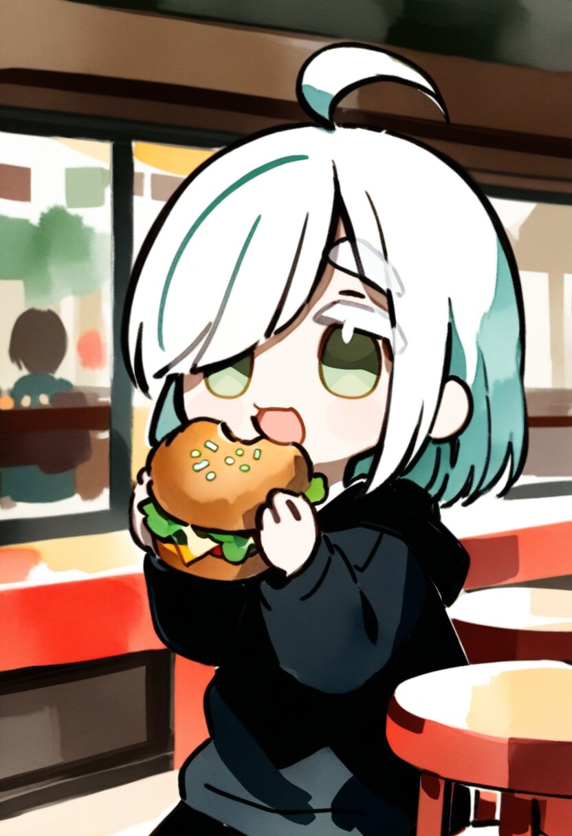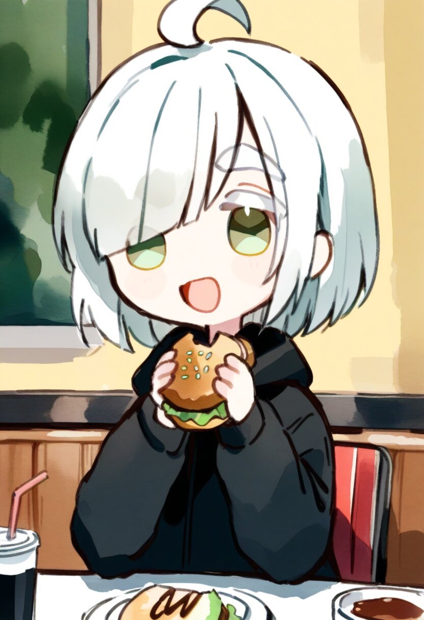 <lora:inmnstylexl:1>, best quality, masterpiece, very aesthetic, watercolor painting, general, chibi, 1 girl, 10 years old, (bright white hair), short hair, blunt bangs, white thick eyebrow, white colored eyelashes, (hair over one eye), ahoge, mintgreen eyes, black oversize hoodie, smile, open mouth, eating, holding hamburger, restaurant
