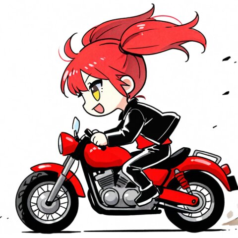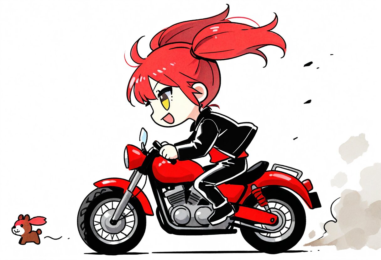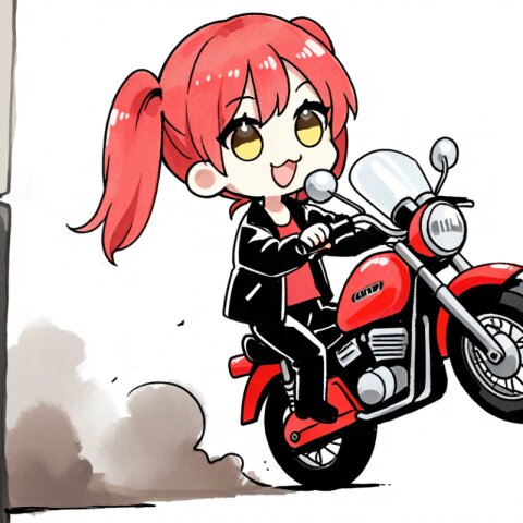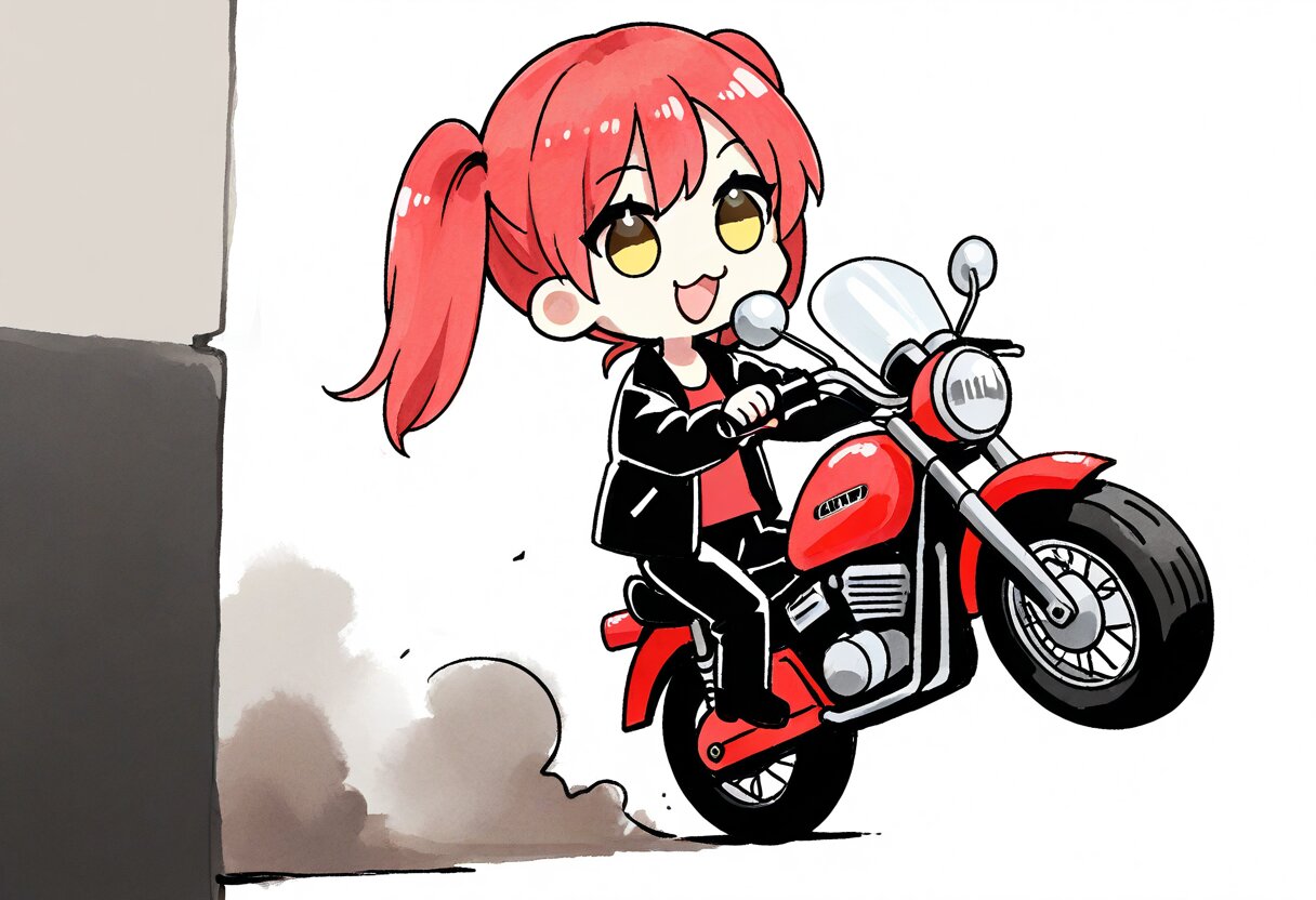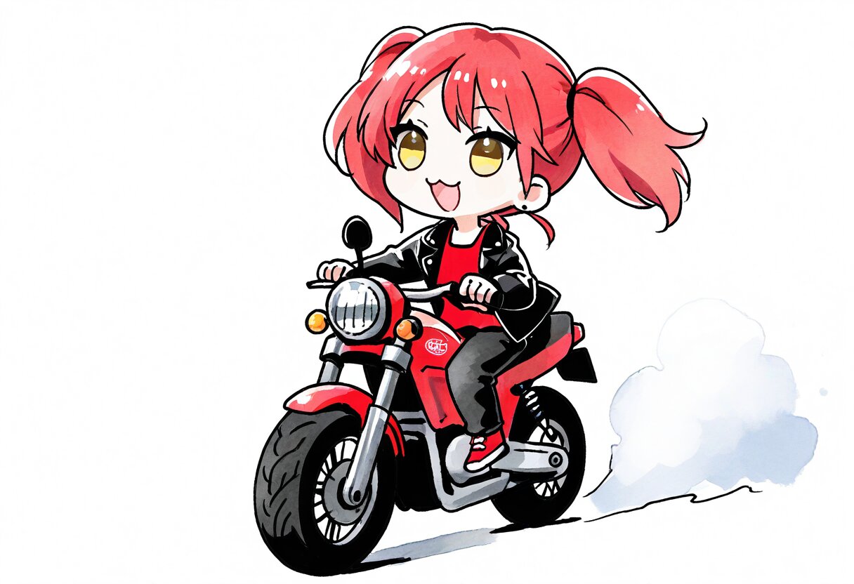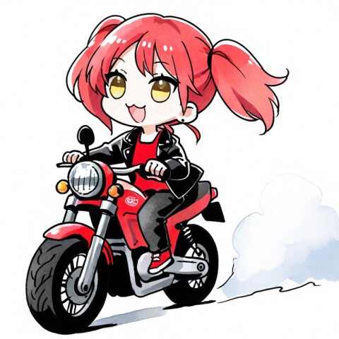 <lora:inmnstyleistkmx:0.8> best quality, masterpiece, very aesthetic, general, watercolor painting, chibi, cute, kawaii, 1 girl, red twintails, yellow eyes, smile, open mouth, red tank top, black leather jacket, black leather pants, rides red motorcycle, exhaust fumes, movement, :3 funny, white background