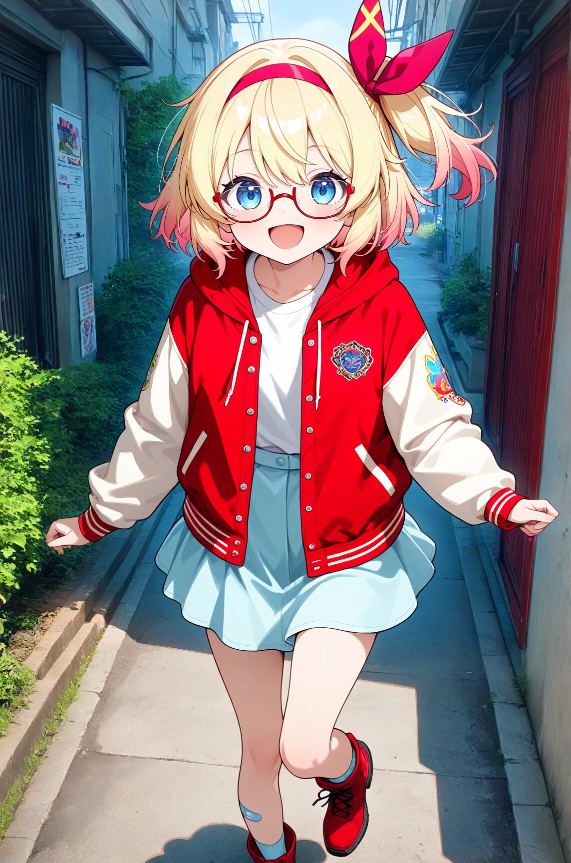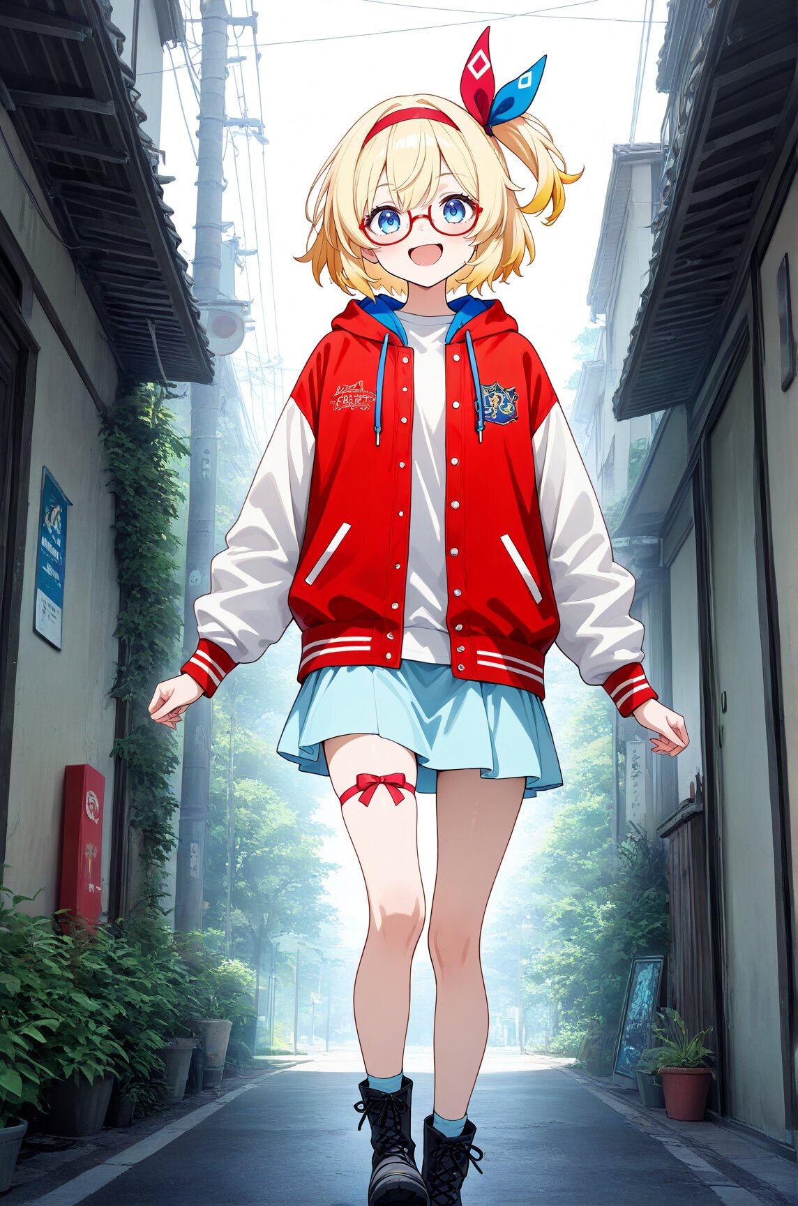 Very cute anime-style girl wearing a costume and boots, illustration, one girl, colorful girl, blonde hair, blue eyes, side ponytail, white shirt, light blue knee-length skirt, varsity jacket runner hoodie, solo, ribbon on leg, ribbon, short hair, hair band, tress ribbon, hair ribbon, red frame glasses, under-rim type glasses. No upper frame makes it a unique character, cheeks are red and mouth is O-shaped smiling, walking in a residential area, masterpiece, best quality, newest, very awa