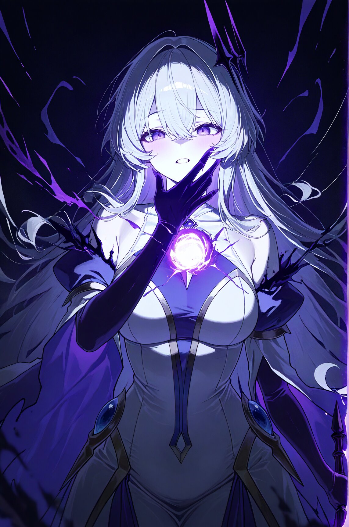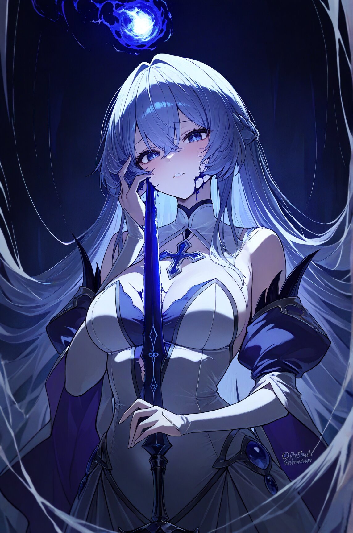 A priestess fallen into darkness, a beautiful girl, a fireball in the palm of one hand, a sword filled with darkness, cutting through one after another like a curse, a demonic woman, beheaded by a holy sword and turned into Dullahan, holding her face in one hand and uttering curse words., masterpiece, best quality, newest, very awa