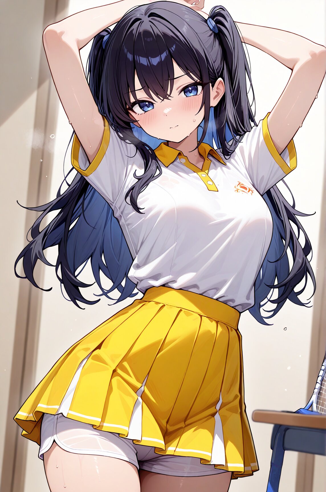 the figure for the anime series school girls in tennis uniform is wearing white shorts and a yellow skirt, 1girl, solo, skirt, shirt, blush, white shirt, arms up, masterpiece, best quality, newest, very awa