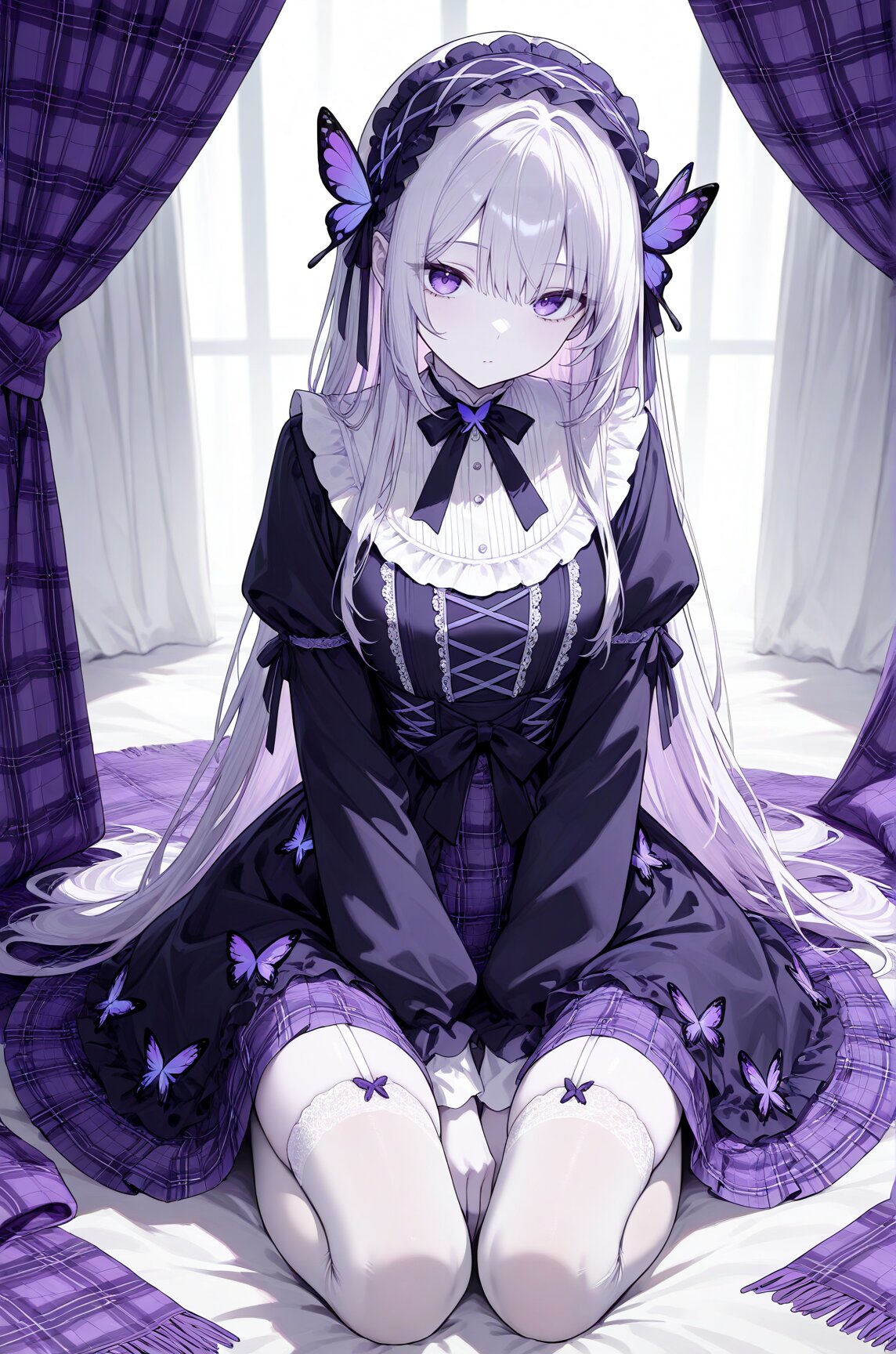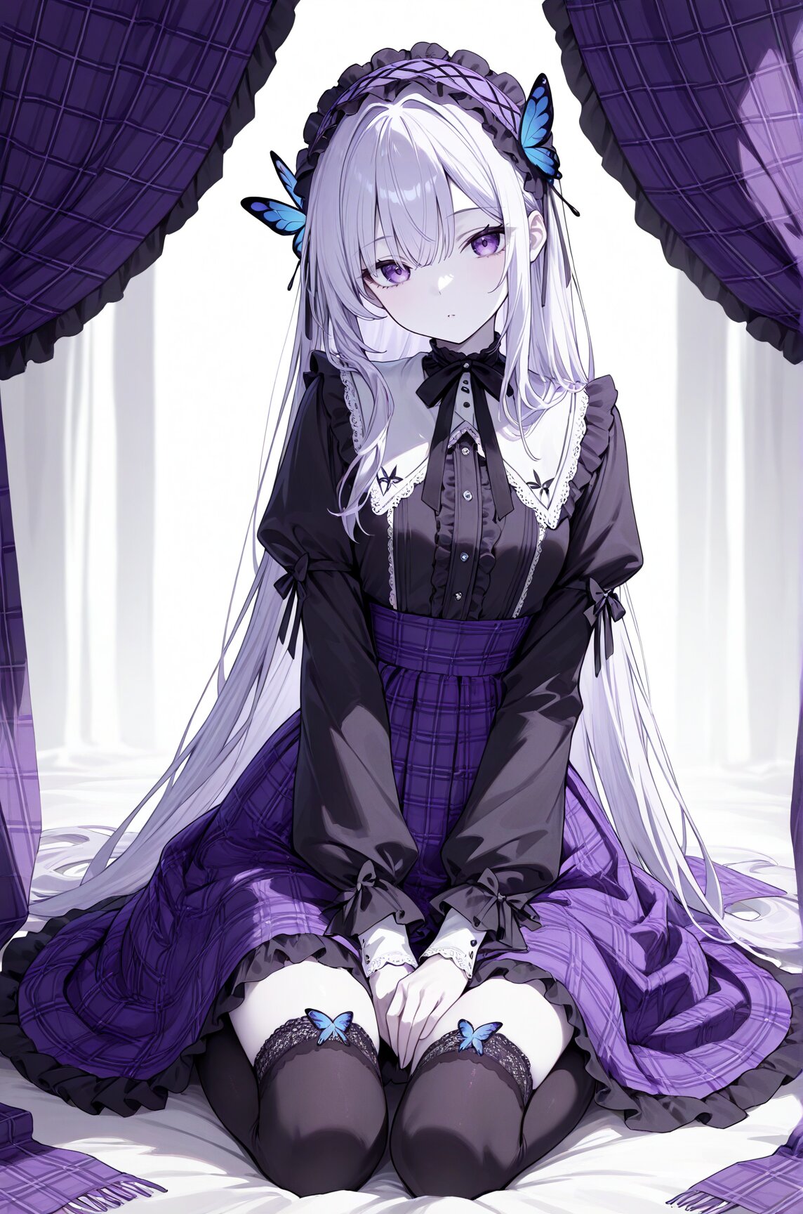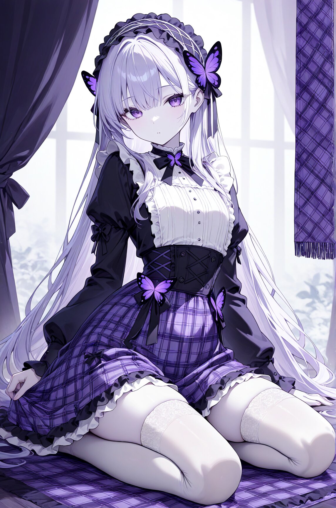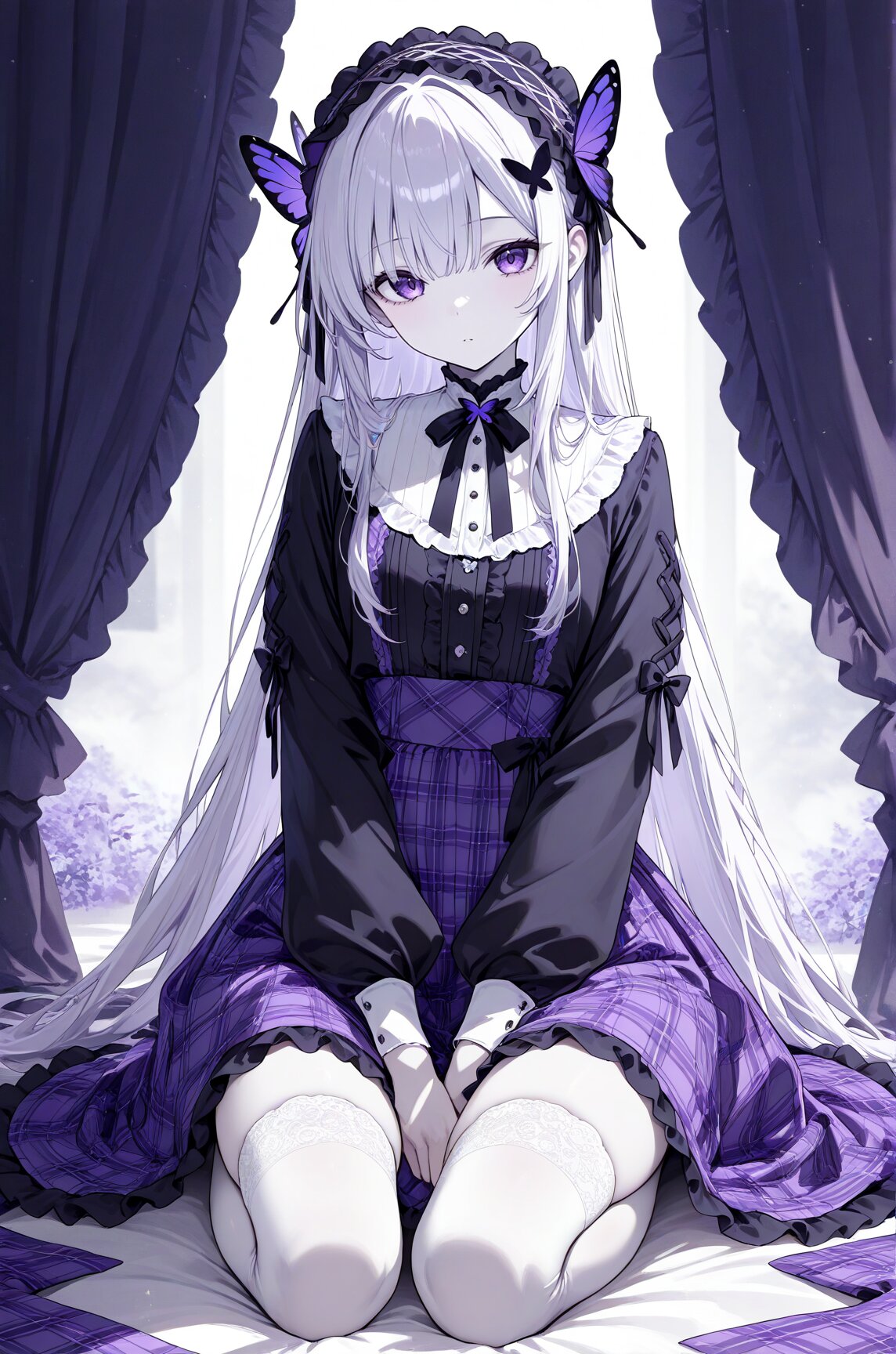 an anime girl with pale skin kneeling on a plaid cloth banner, 1girl, purple eyes, long hair, butterfly hair ornament, hairband, lolita hairband, solo, thighhighs, hair ornament, sitting, masterpiece, best quality, newest, very awa