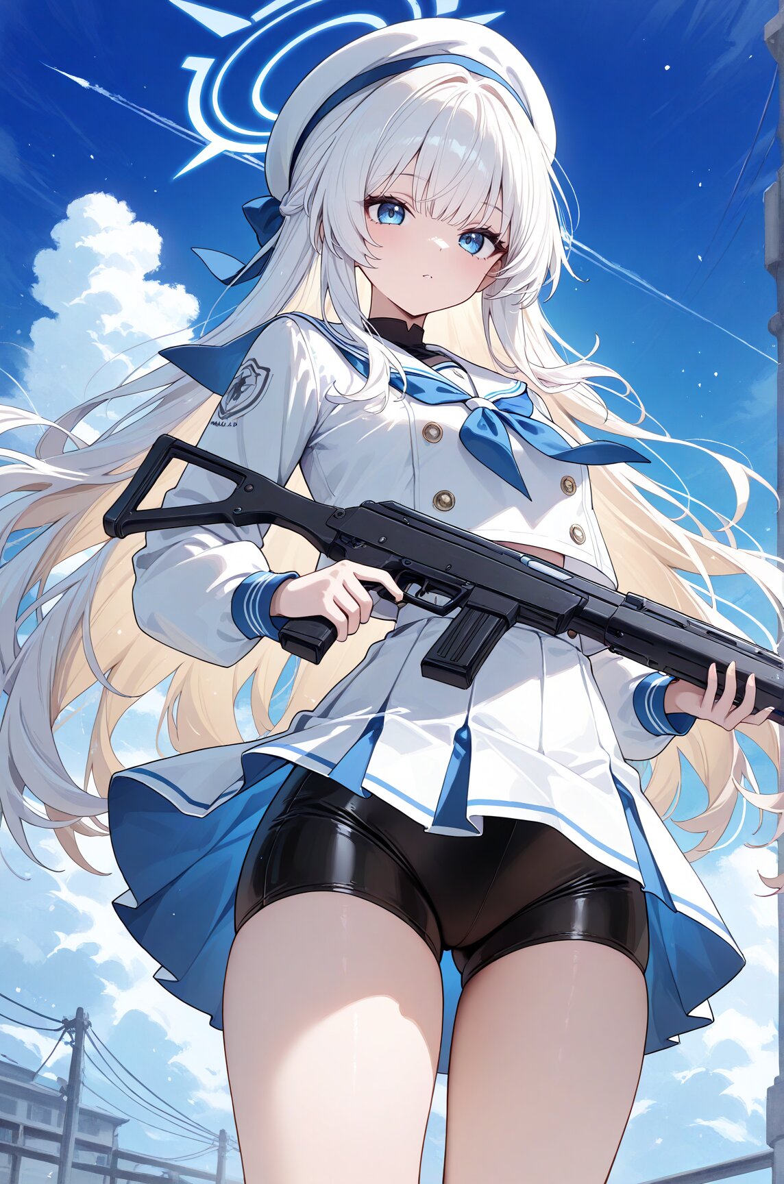 Anime cartoon character with long blonde white hair and white clothes holding a gun in the air, one girl, compression shorts, solo, hat, blue eyes, school uniform, long hair, blonde, masterpiece, best quality, newest, very awa