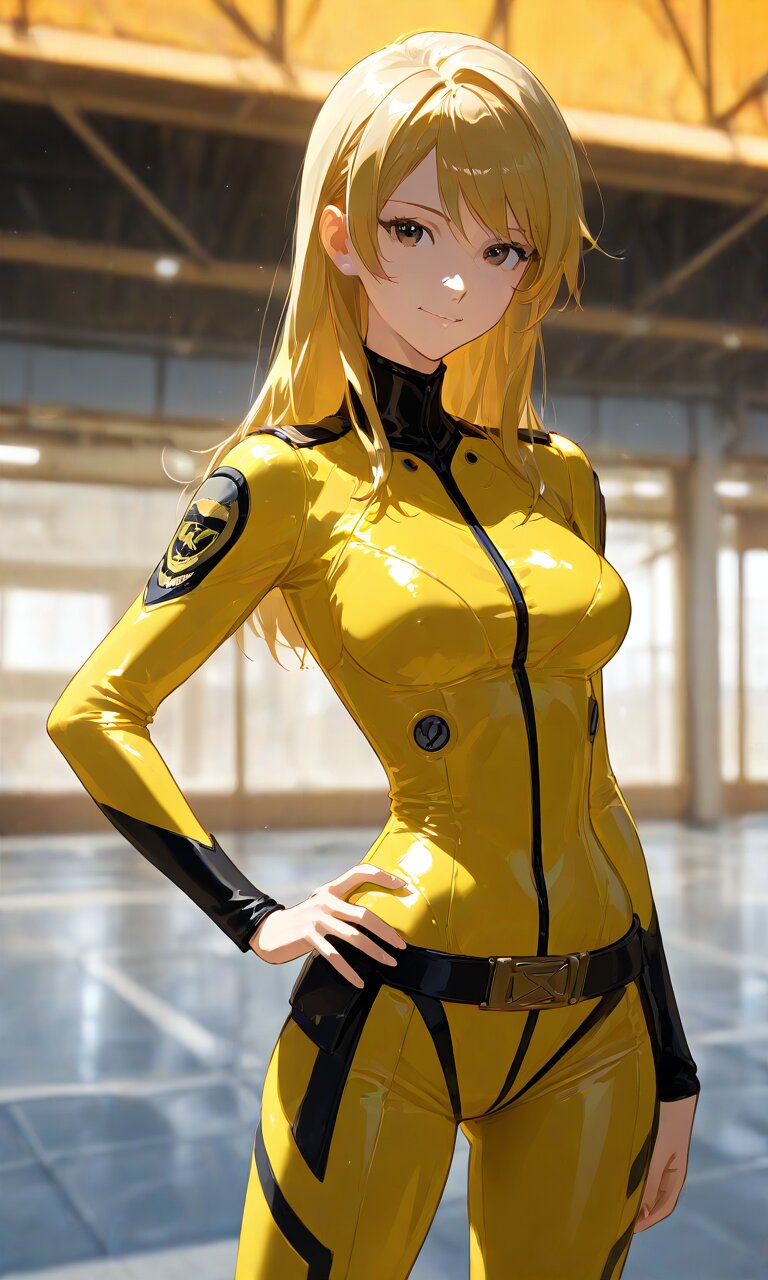1 lady, smile, hand on hip, cowboy shot, ,fyuk1, yellow bodysuit