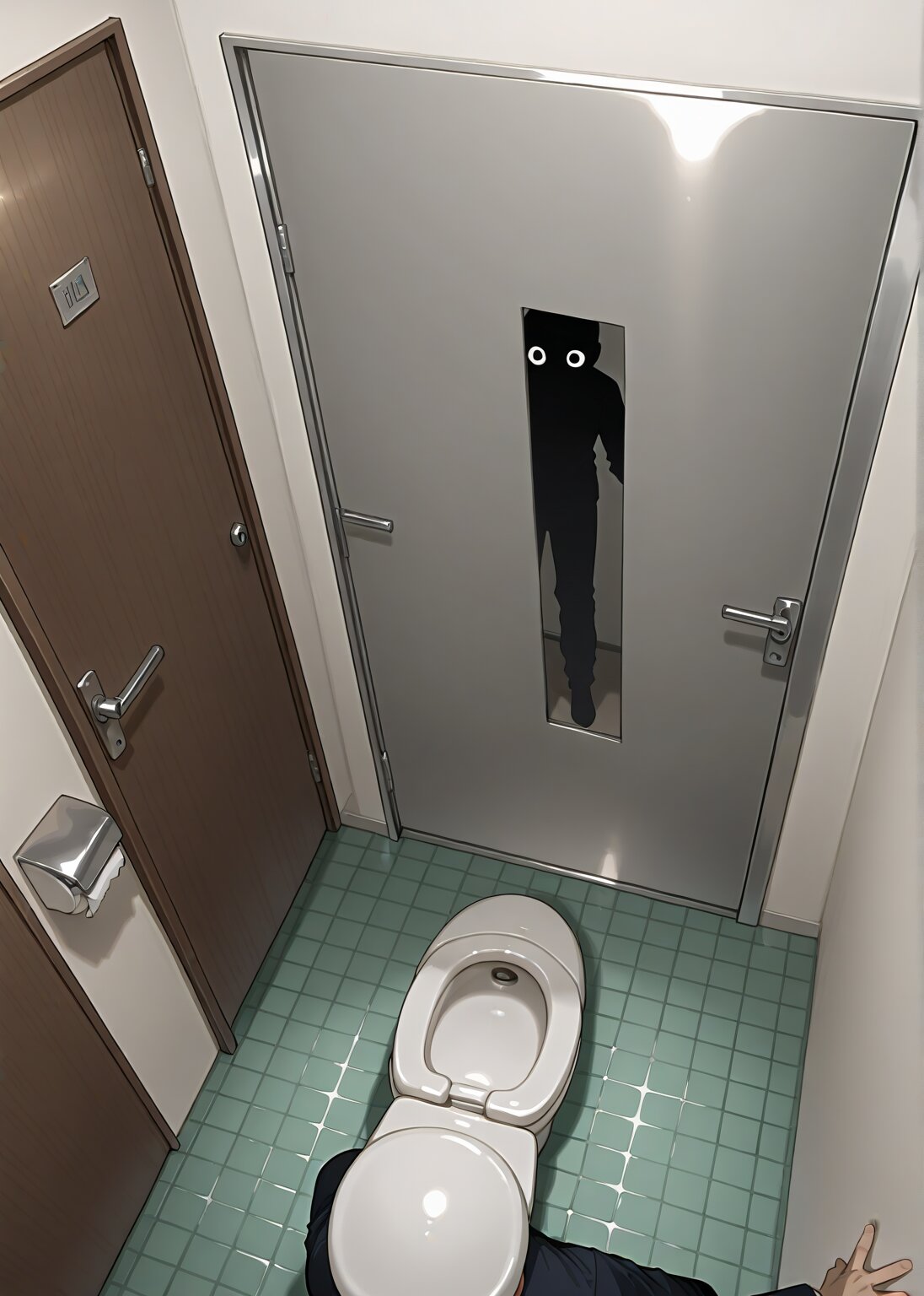A roofless room, 1boy, Man peeking through door, 1girl, from above, Private toilet door, door, stretch legs,