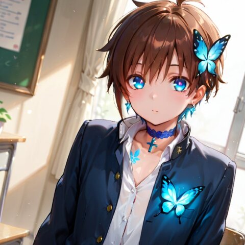 1girl, solo, Uncensored, exquisitely drawn illustration, masterpiece, best quality, amazing quality, very aesthetic, absurd, latest, anime coloring, subsurface scattering, realistic shading, natural light, focus, solo, smiling, gakuran, dynamic angle, classroom background, Axs, Blake, cute and childish 17-year-old, boyish big breasts, shiny green hair, Nakano Ichika hairstyle, Blake (shiny green hair, Nakano Ichika hairstyle), very short hair, (red red horns succubus horns, big red gemstone eyes: 1.3), blue butterfly hair ornament, (short pointed ears, succubus ears: 1.3), (thick short devil tail, thick heart-shaped tail), very short hair, big blue gemstone eyes, blue butterfly hair ornament, shiny cross earrings, inner blue hair, cross lace choker: 1.0, blue gemstone eyes, Blake, jet black gakuran uniform, boys' uniform, thick black gakuran jacket, white button-up shirt, jet black gakuran pants Blake、((glowing from inside pants, pubic hair tattoo on pants, glowing tattoo), butterfly tattoo, red bat mark, glowing desire mark) masterpiece,amazing quality,very aesthetic,absurdres,Cute,depth of field,volumetric lighting,high resolution,minimalism,flat color