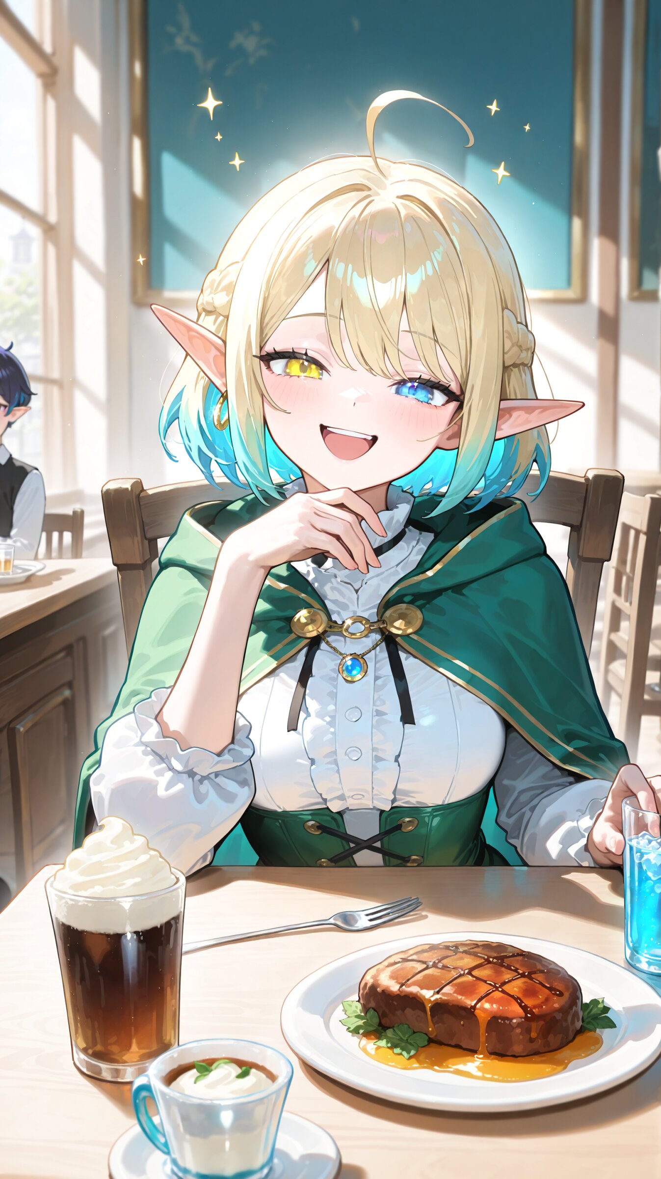 (four elf girls:1.2), having a drinking party at a restaurant. (The restaurant's rooftop terrace offers breathtaking panoramic views of the medieval fantasy town:1.2). They are seated around a round table, drinking, chatting, and enjoying their food. Please show their joyous expressions and the sense of camaraderie between them, (noon:1.3), soft natural sunlight, (cowboy shot:1.3), from behind, looking another,looking at viewer, perfect anatomy, with fork ,spoon,,, , eating cashew nuts on plate, Codfish Steak on plate, professional anime art lots of details, Delicate and vivid dishe, glint, glitter, glowing food,, overexposure, shiny-glistening, (watercolor style:0.8), (pastel color style:1.3) super fine concept art, hard surface, 8K, unreal engine, masterpiece, best quality, amazing quality, very aesthetic, absurdres, <lora:noline (1):-0.5> <lora:sdxl2-flat2-512b:0.0> <lora:facelightup_xl_v10:0.5>
