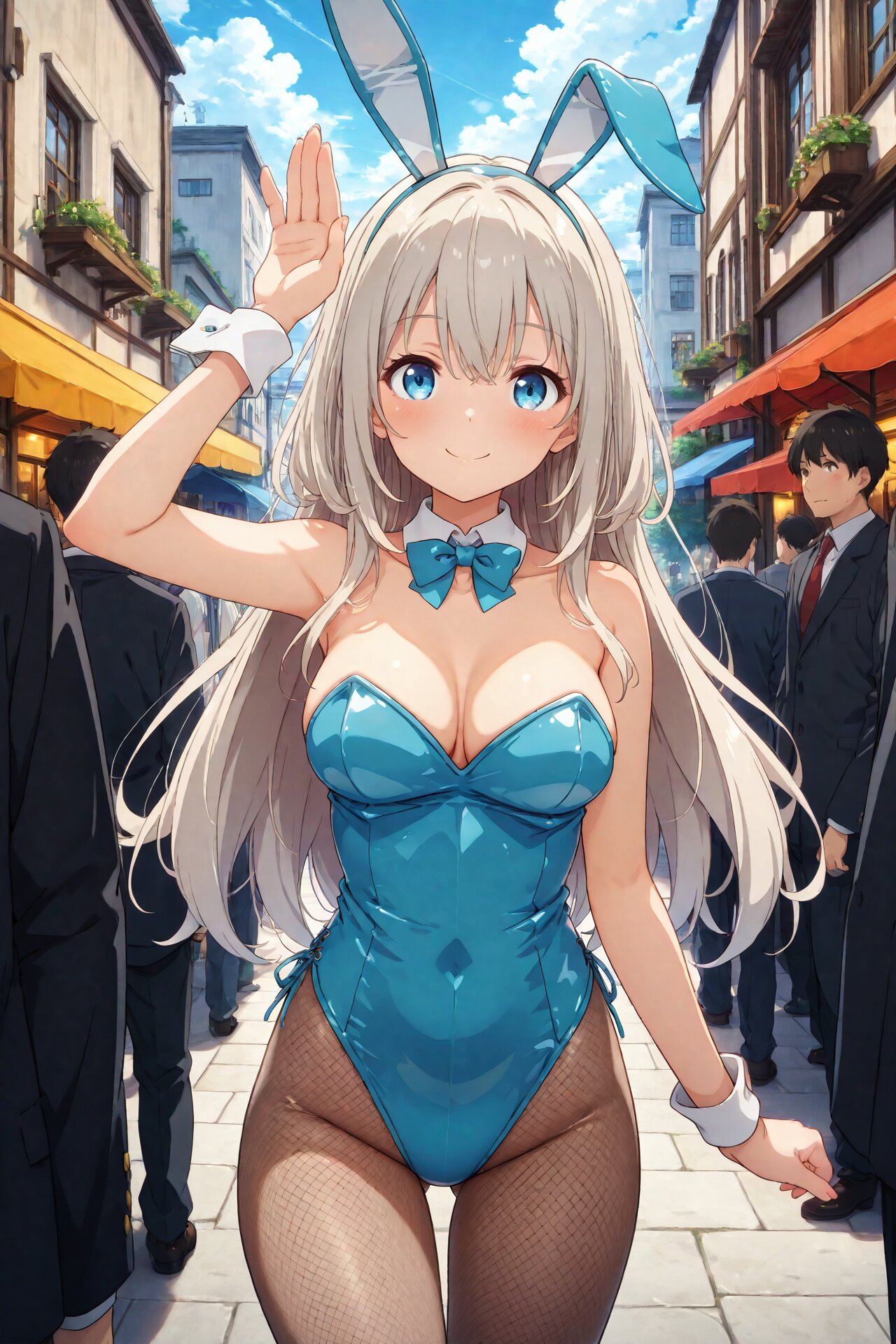 masterpiece, best_quality, playboy bunny, outdoors, smile,