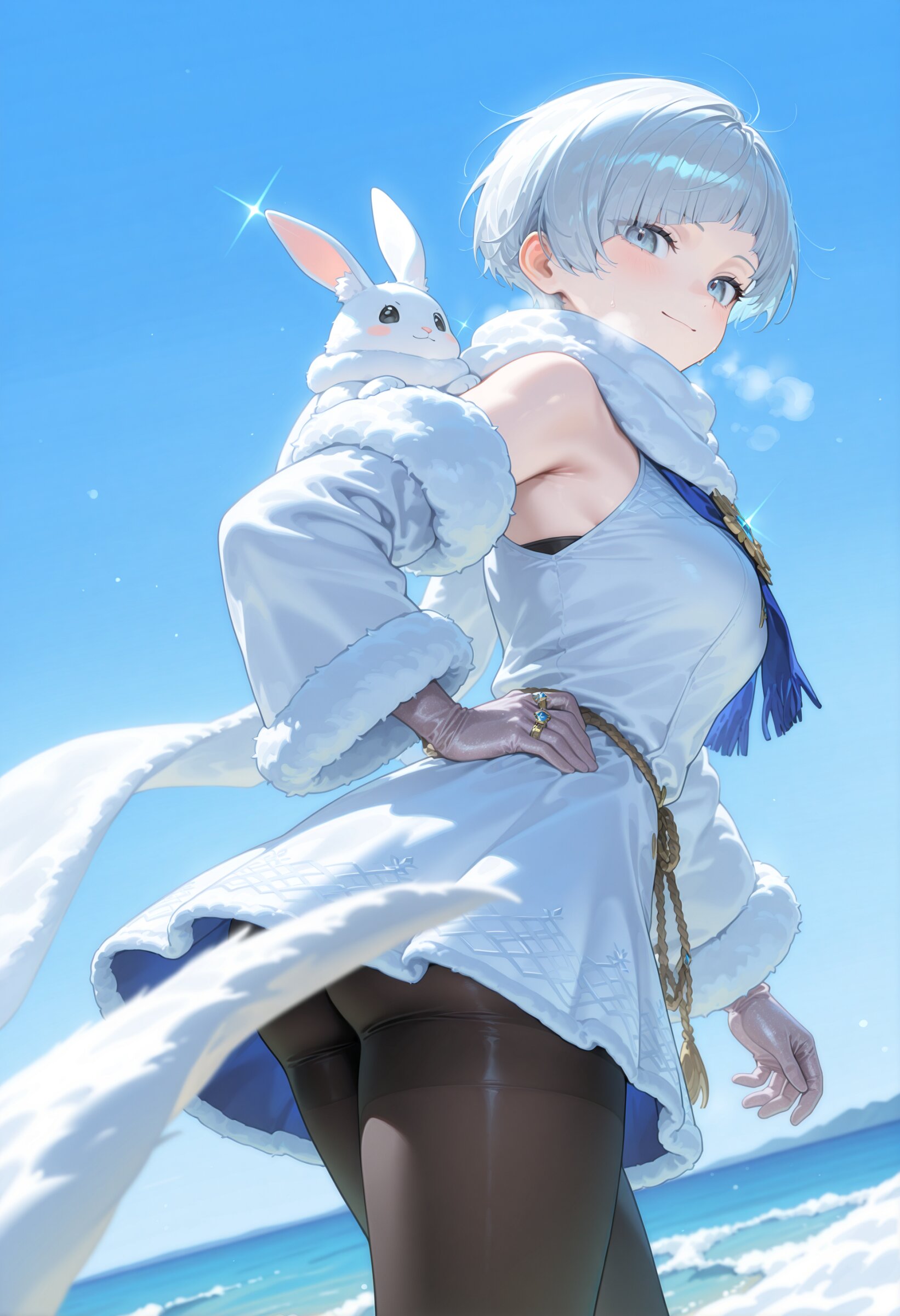 (close up:1.2) from behind, looking back, looking at viewer,, in winter morning, 1girl, short hair, very short hair, pixie cut,diagonal bangs , fine hair, lightgray hair, 15yo, ,, lightgray eyes, first-rate female bodies perfect body beautiful medium breasts medium hips, skindentation, pantyhose, (wearing winter clothes, winter scarf, , fur gloves, fur coat:1.1), , lightgray High grade chiffon dress,bule flower pattern in uniform,(detached sleeves,wide sleeves),(silk gloves), in fur coat, long sleeves, wearing winter clothes, winter scarf, mittens, black inner, Rings, sleeves past wrists (shy smile:1.0), winter atmosphere, winter sky, At the bottom of a quiet sea lies a sunken ship dungeon from a Western fantasy world, mystical and telling of its former glory. Broken masts and torn sails speak of a history submerged by a powerful storm. Inside, sea creatures have made their home among rusted cannons and a broken helm. A treasure room with piles of chests is guarded by magic, challenging those who seek its riches to solve complex puzzles. Surrounding the ship, sea monsters lurk, awaiting adventurers. This dungeon is known as a place that tests one's courage and wisdom. light leak, glint, Fluffy serious rabbit on back inward v masterpiece, best quality, amazing quality, very aesthetic, absurdres, professional art lots of details, , overexposure, shiny-glistening, (watercolor style:1.2), (pastel color style:1.0) <lora:noline (1):-1.0> <lora:sdxl2-flat2-512b:-0.8> <lora:facelightup_xl_v10:0.5>