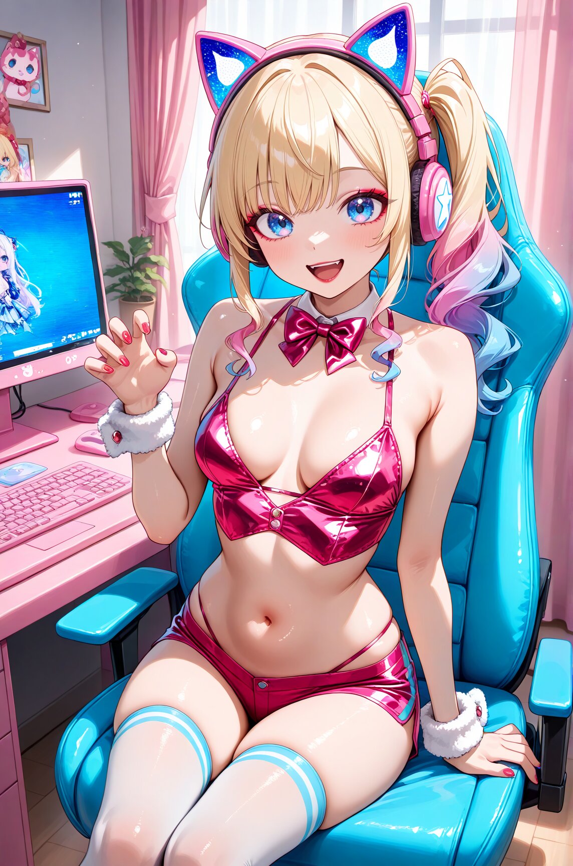More creative, vivid, anime illustration, smiling, masterpiece, best quality, high resolution, more details, realistic, more accurate, HDR, 8K, petite and short girl, colorful girl, perfect body, D cup, blue eyes, big eyes, shiny glitter, pastel color style, blonde, long wavy hair, side ponytail, pink and blue striped hair, detailed makeup, red lipstick, red nails, sexy pink cat ears outfit, no strings, shorts, no sleeves, no pants, cat bow tie, cat cuffs, white stockings, happy, smiling, cat ears headphones, sitting, game room with pink curtains, pink computer desk, blue game chair, beautiful hands, pink nails, shiny skin, shiny hair, erotic eyes, erotic lips, erotic body, medium breasts, erotic breasts, attracts men,, masterpiece, best quality, newest, very awa