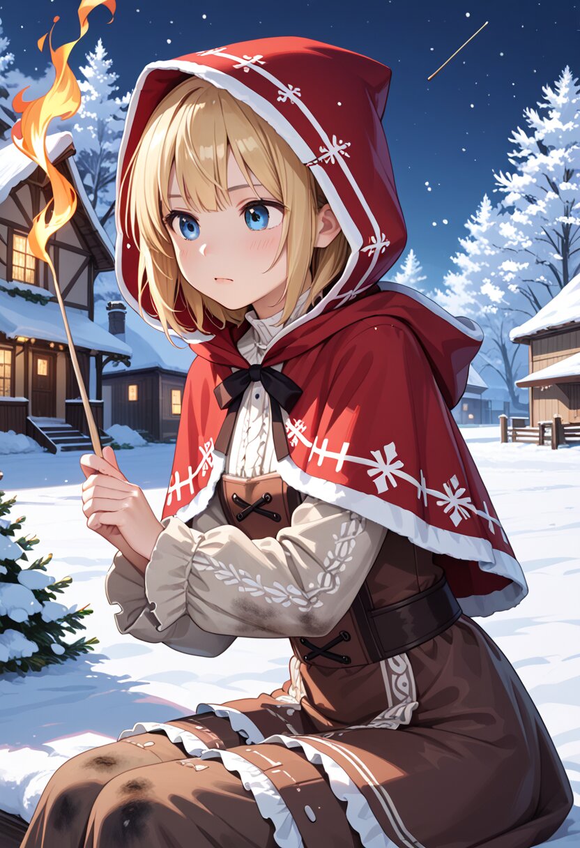 score_9,score_8_up,score_7_up,source_anime,anime_coloring,anime_screencap,quality_best,photo realistic,1girl inspired by "The Little Match Girl",lolita,petite,10 yo,blonde hair,blue eyes, BREAK (snow, winter, night:1.3),night,sitting down alone at a snowy Back alleys of medieval Europe,stone wall,(wearing poor clothes,Tattered clothes,dirty patched clothes,red hood:1.3),(holding a Matchstick in her hand,looking at Matchstick in her hand,the flame of a Matchstick:1.3),(basket full of Matchboxs),