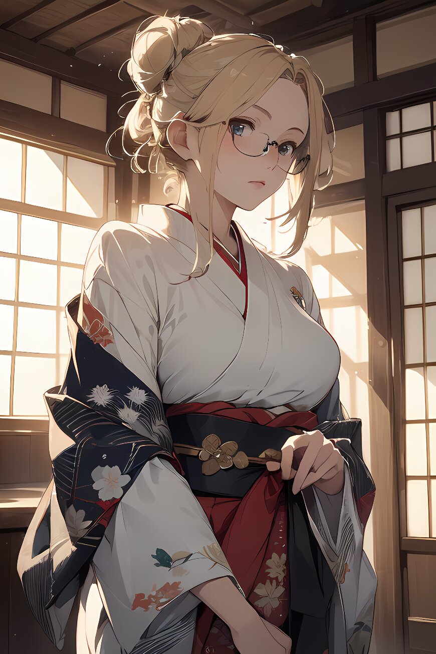 1 lady, hair bun, blonde hair, glasses, ((Japanese cloth)), Japanese room, seiza cowboy shot, Art Style 2.0
