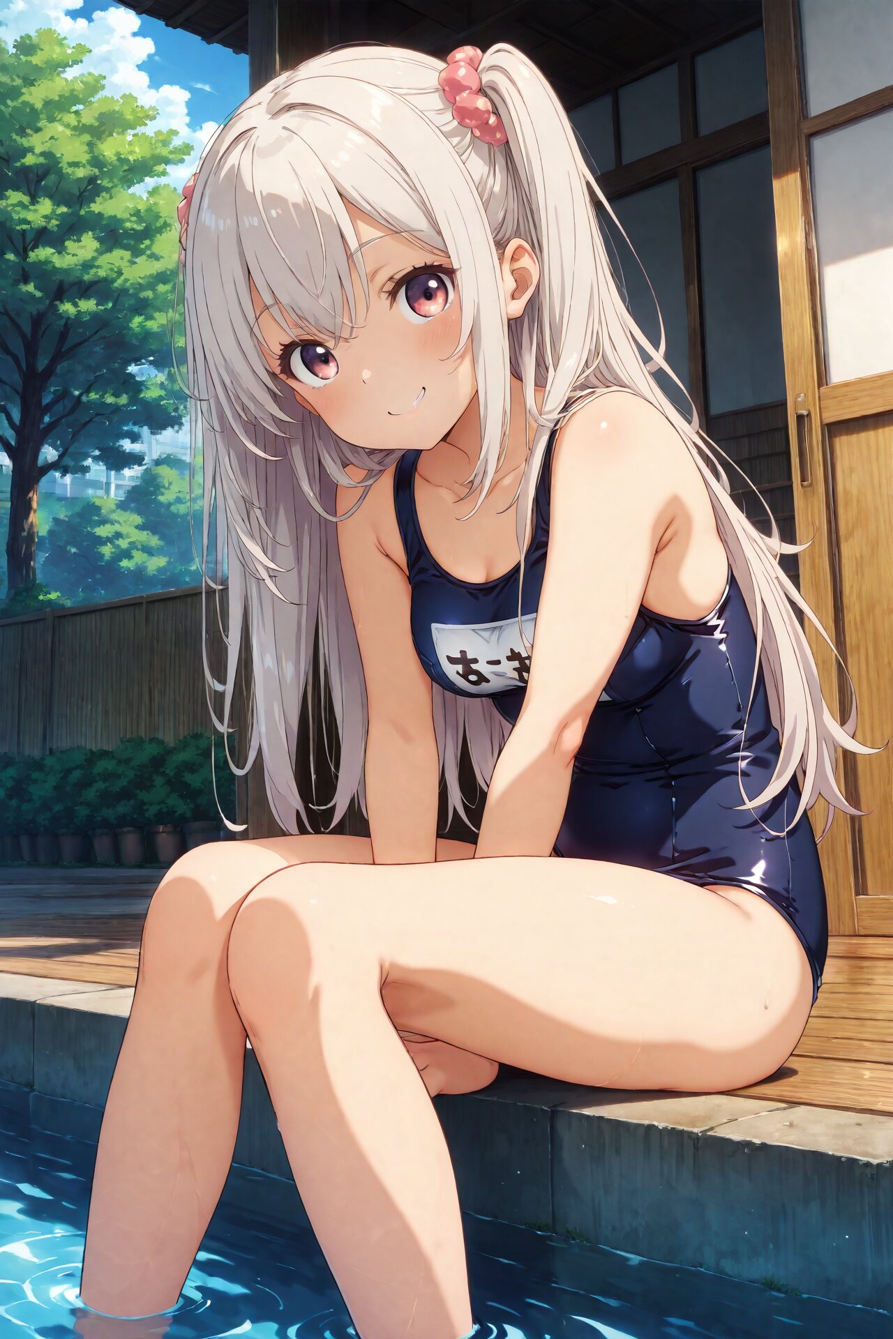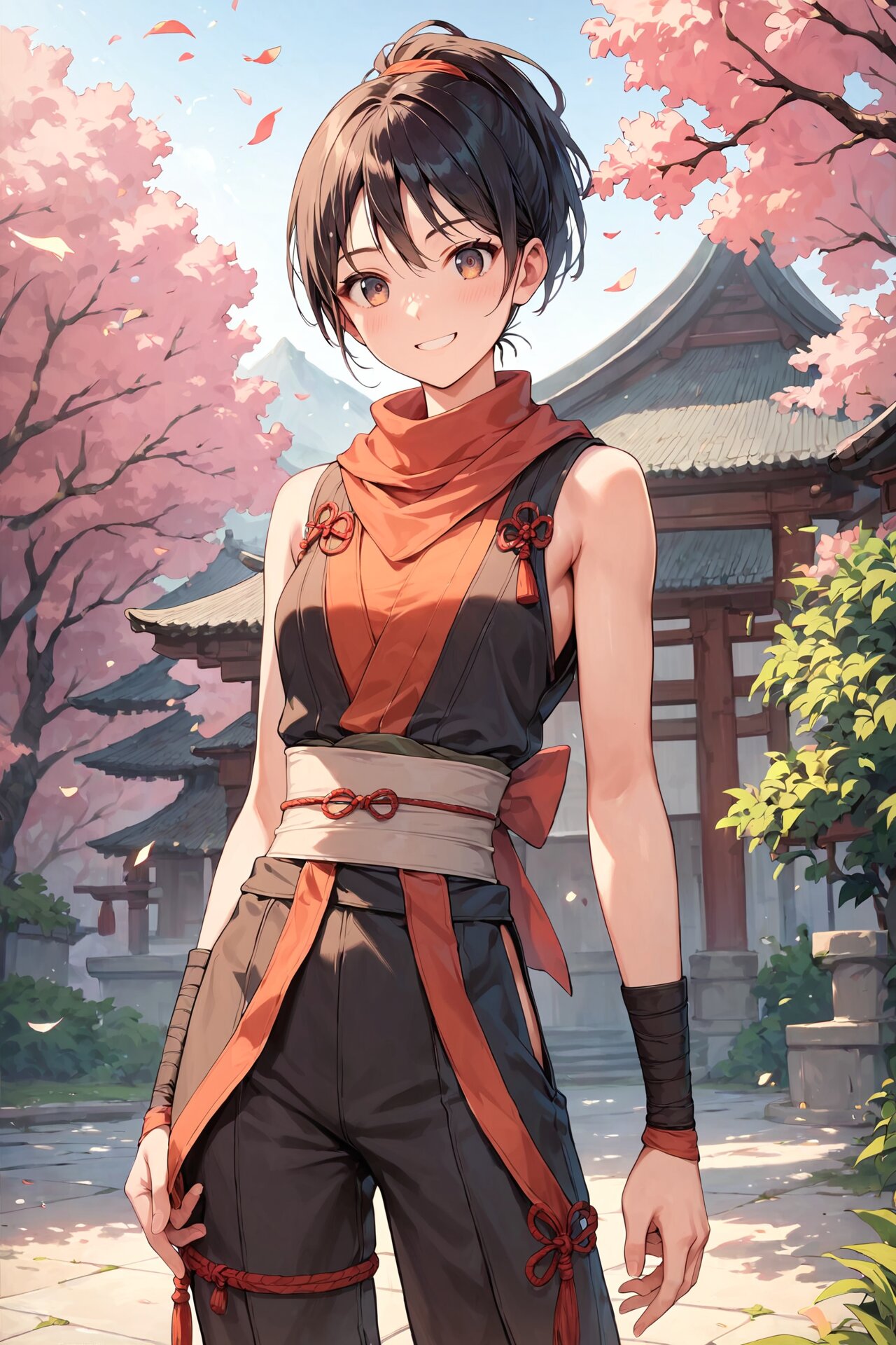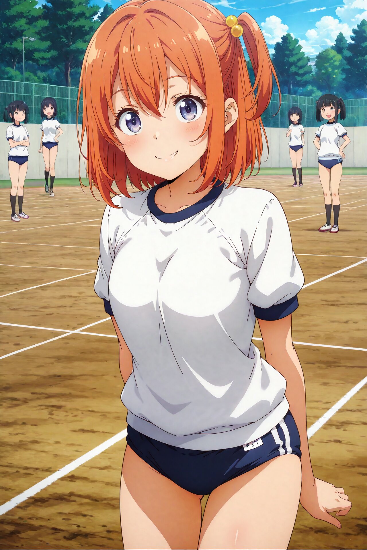masterpiece, best_quality, anime_screencap, buruma, gym uniform, outdoors, smile,