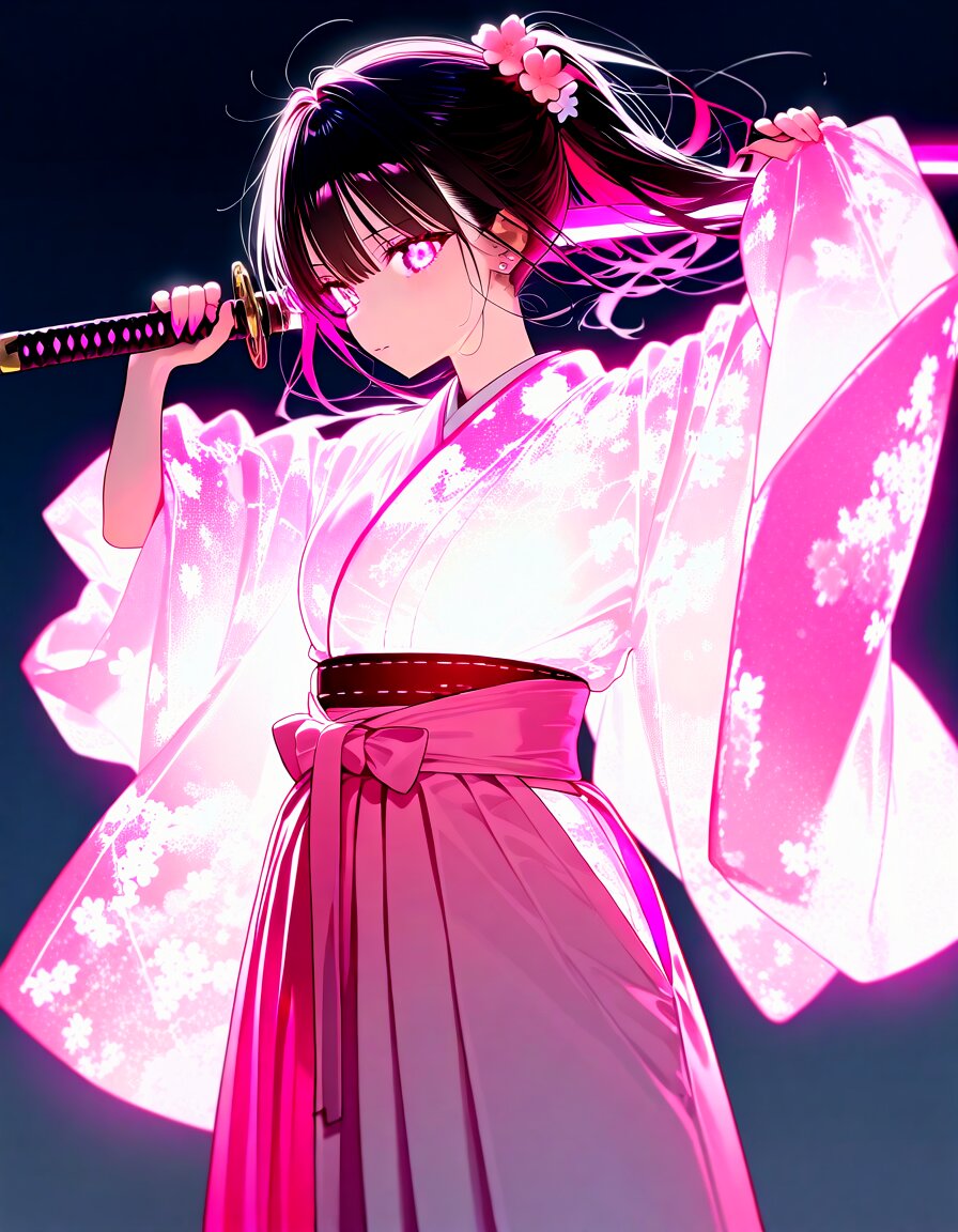 1girl, solo, momotarou, pink kimono, peach flower motived, hakama, holding katana, masterpiece, best quality, good quality, newest, glowing kimono, <lora:NOOB_vp1_detailer_by_volnovik_v1:1>, <lora:glowing-kimono-il-01:0.8>, <lora:anatomy_helper:0.6>