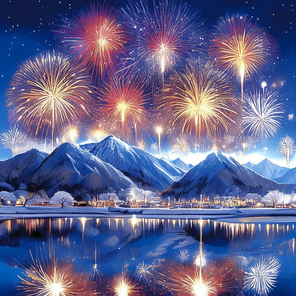A serene winter landscape illuminated by a spectacular display of fireworks. Snow-covered mountains stretch across the horizon, reflecting the vibrant colors of the fireworks in the clear, starry night sky. In the foreground, delicate frost-covered trees and a frozen lake shimmer under the glow of the pyrotechnics. The fireworks burst into a kaleidoscope of colors--bright reds, blues, and golds--casting a magical light on the snowy ground. Soft snowflakes drift through the air, adding to the peaceful yet festive ambiance. The scene evokes a sense of wonder and tranquility, blending the beauty of winter with the celebration of fireworks.