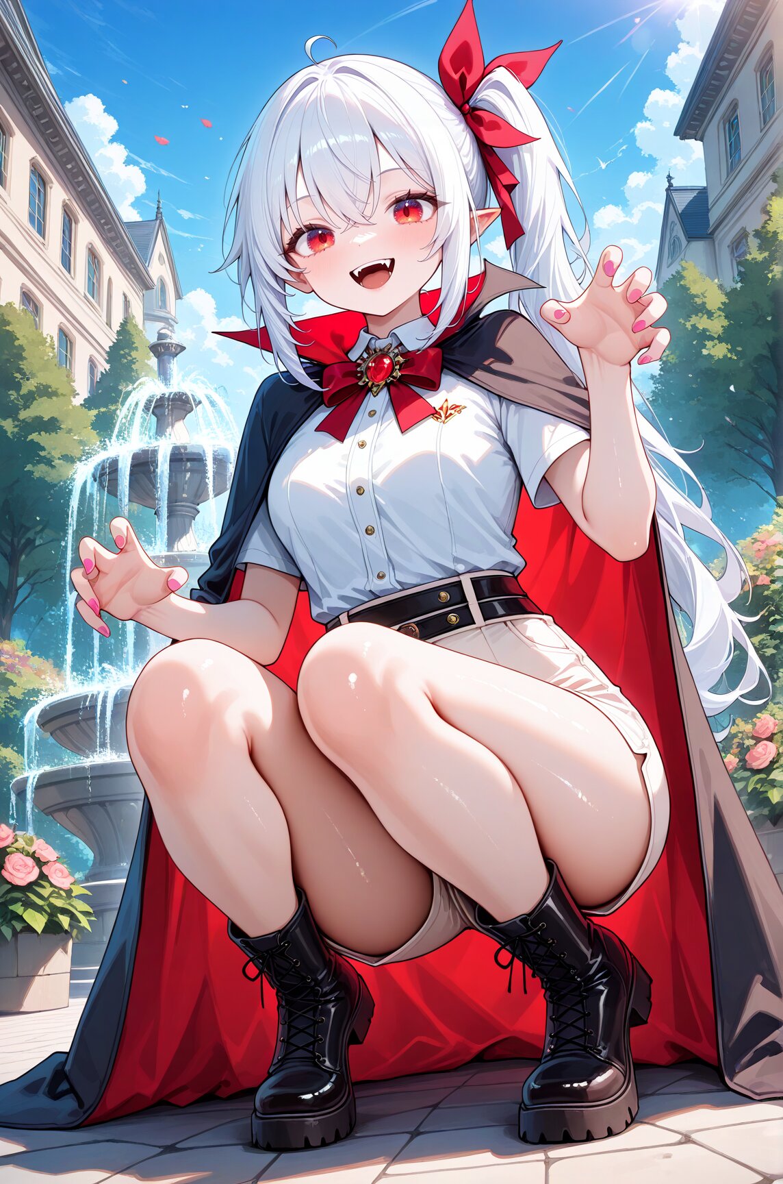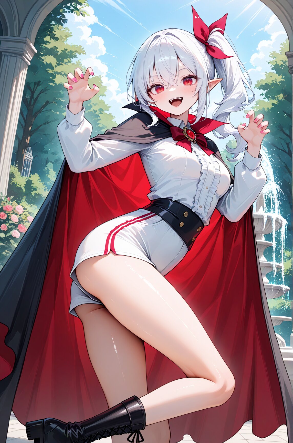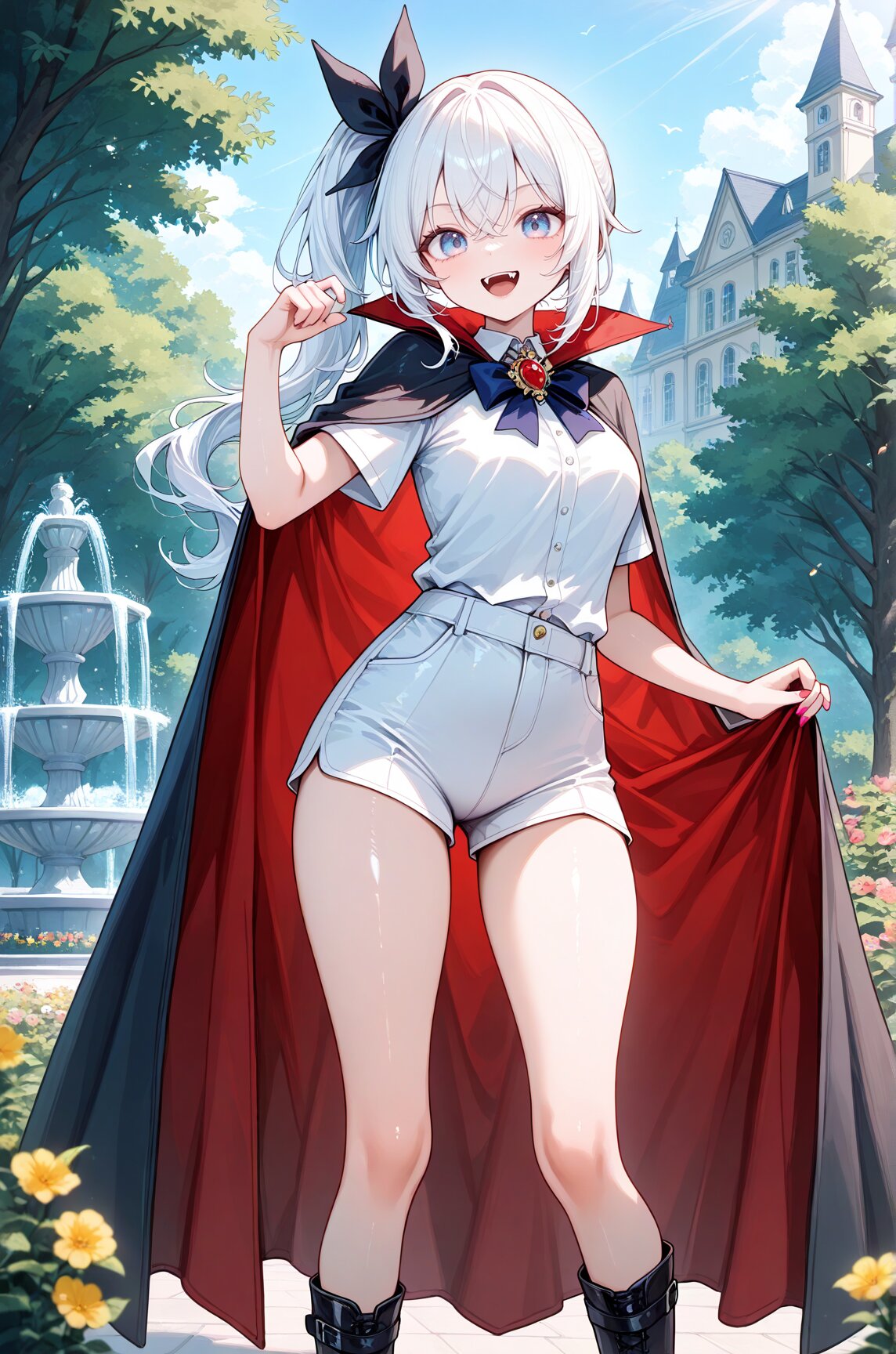 More creative,vivid,anime illustration,smiling face,masterpiece,highest quality,high resolution,more details,more accurate,HDR,32K,1 person,cute girl,petite and short girl,short girl,colorful girl,girl,artwork,beautiful eyes,big eyes,ruby red rainbow eyes,deep eyes,animation,Dorothy is a short girl with silvery white hair and light skin,with long hair,side ponytail and a large ribbon,her look is secured by a flower-shaped brooch on her cloak. The cloak is overlapping,her insignia is on the cloak cape,she has a fluffy shaft light colored shirt that goes down just below her knees under the cloak,light colored shorts,boots,mansion garden,fountain,daywalker,vampire,fangs,morning sunlight,sunny day,shadowboxing for exercise,latest,AI generated,beautiful hands,pink nails,shiny skin,shiny hair,erotic eyes,erotic lips,erotic body,medium breasts,erotic chest,erotic ass,attracts men,fingers are precise,, masterpiece, best quality, newest, very awa