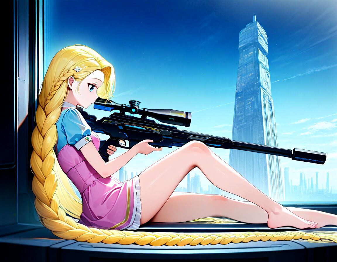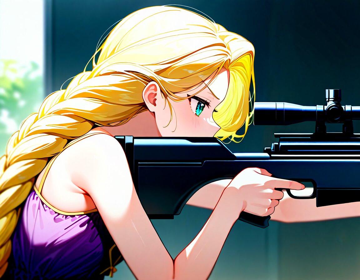 1girl, rapunzel, original, 18yo, sniper, aiming sniper rifle, very long hair, single braid, blonde hair, from side, depth of field, concentrating, sensitive, masterpiece, best quality, good quality, newest, <lora:NOOB_vp1_detailer_by_volnovik_v1:1> ,