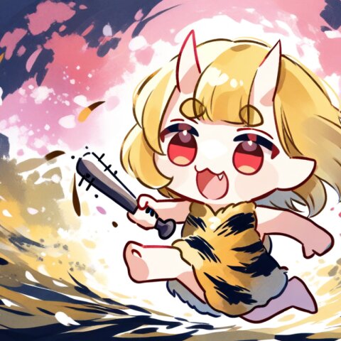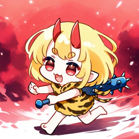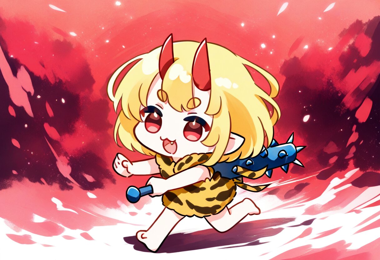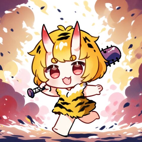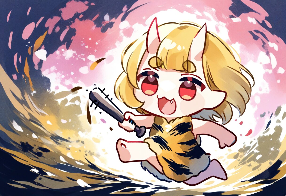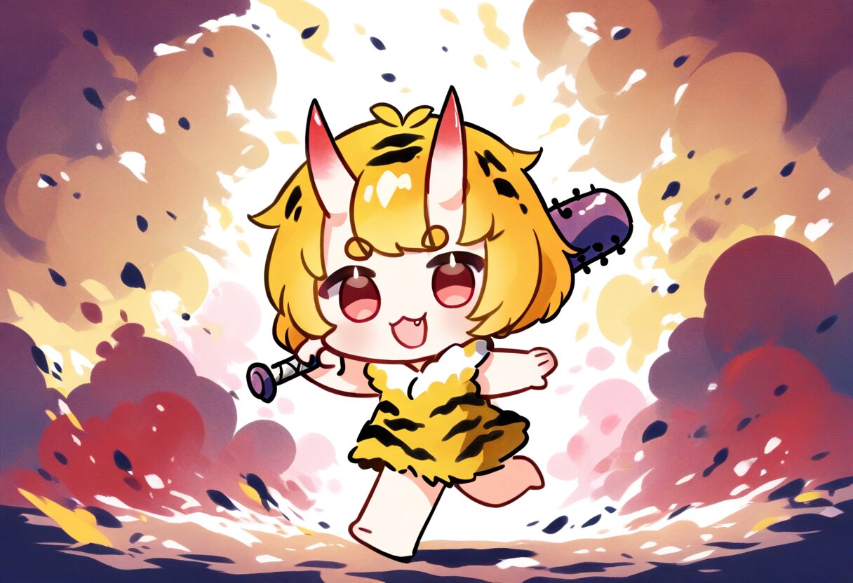 <lora:inmnsylexl4:1>best quality, masterpiece, very aesthetic, general, watercolor painting, kawaii, chibi, 1girl, (oni horns:1.2), yellow short hair, red eyes, :3, open mouth, fang, thick eyebrow, tiger fur dress, sleeveless, barefoot, holding nail bat, running