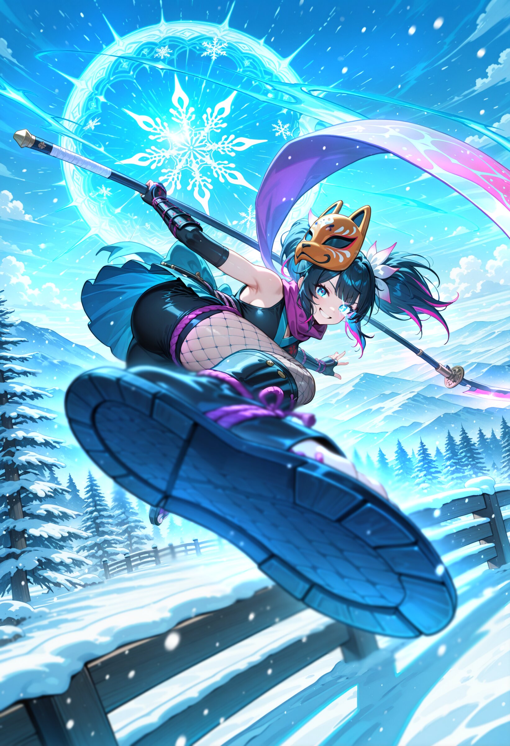 foreshortening, (close up:1.3), knees out of frame , medieval japanese fantasy world Atop a towering spire, a sky garden dungeon unfolds as a marvel set against the Western fantasy world's sky. A large gate opening towards the heavens, with a magic-suspended bridge, welcomes visitors. Inside, variegated summer flowers bloom amidst lush trees that adorn the sky. The centerpiece is a crystal-clear pond, sparkling with reflected sunlight. This dungeon symbolizes the harmony of nature's beauty and magic, representing a symbol of peace., , 1girl, samurai, (muscular female:0.65), multicolored hair, cyan and lapislazuli and orange and hotpink hair, long hair, twintails Slicked back hair , , glowing eye, eye trail, beautiful lapislazuli eyes large breasts, ,, ninja cloth, short kimono, obijime, fishnet inner, fishnets, fishnet thighhighs, ninja pants, kote, (ninjutsu:1.1), (wearing big shuriken:1.1) fox mask, , magenta scarf, zouri, japanese winter clothes, mysterious atmosphere, seductive smile, dynamic pose, kung fu attack, kung fu action, kuji-in, snowing, clouds, heavy snow, fur trim cast a magic, swirling energy,energy magic, floating huge scythe, depth of field, bokeh, snowing, snowflakes, snow, first sunrise of new year, super fine concept art, hard surface, 8K, unreal engine, masterpiece, best quality, amazing quality, very aesthetic, absurdres, you can add scenery, (volumetric lighting), To make the background more distinctive. professional art lots of details, , overexposure, shiny-glistening, (watercolor style:0.5), (pastel color style:0.5) <lora:noline (1):-0.5> <lora:sdxl2-flat2-512b:-1.0> <lora:facelightup_xl_v10:0.5>