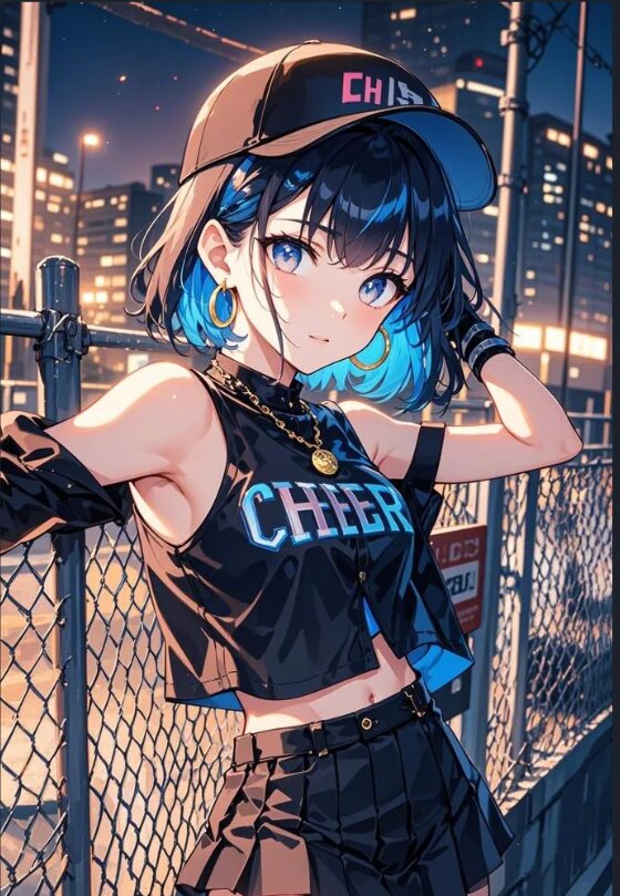 1girl, black hair, short hair, blue inner hair, one eye is hidden by bangs, expressionless, expressionless, wearing a black cheerleader outfit, hoop Earrings, night cityscape, leaning against the fence, looking at viewer, wearing baseball cap, anime illustration