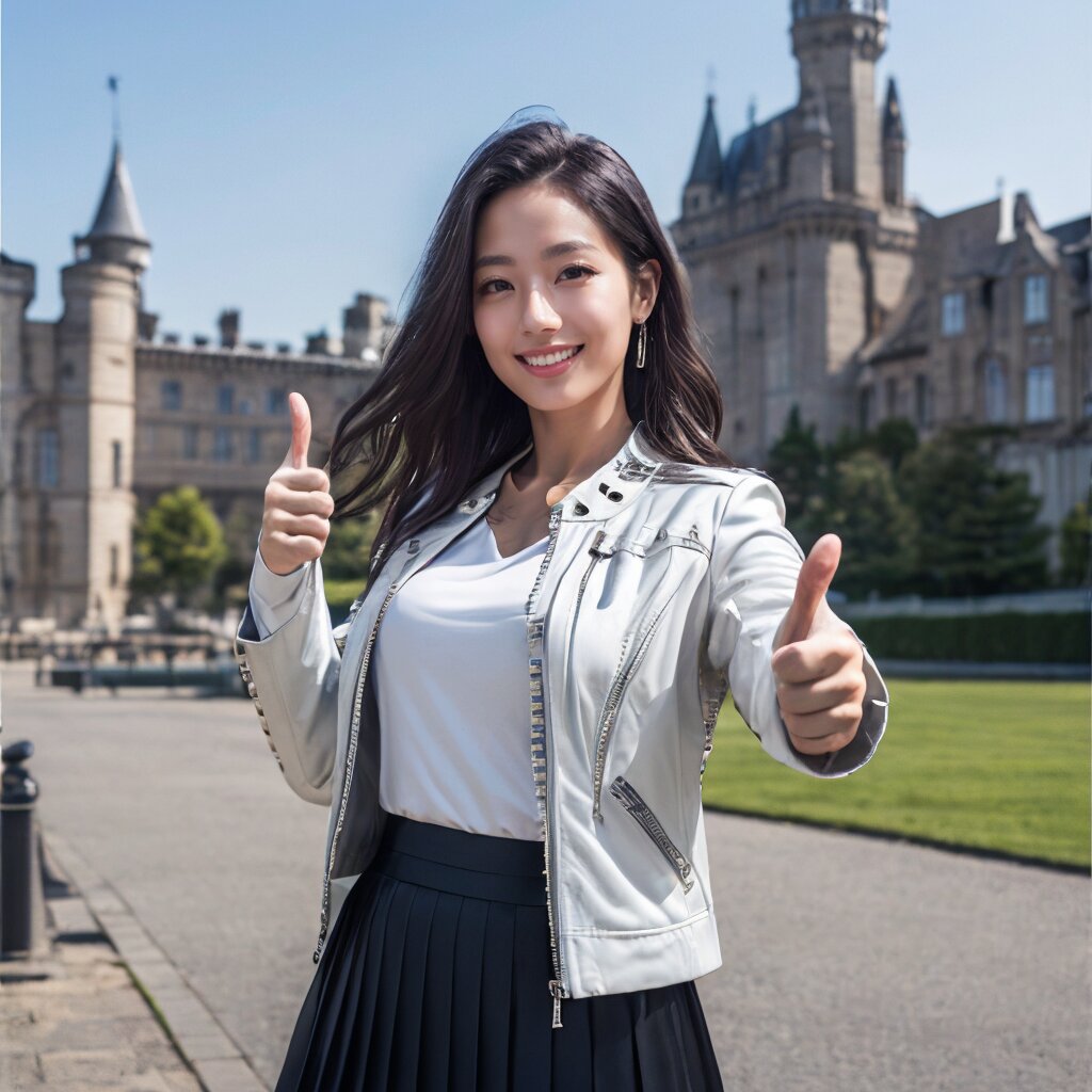 (high quality, ultra detailed, best quality, masterpiece, 4k:1.2),(realistic:1.2),(RAW photo:1.2),detailed skin,Full lips,accessories,skirt,(black pleated skirt:1.2),(garter belt:1.2),bell sleeve,(white jacket with studs:1.3),gorgeous castle background,seductive_smile,(Thumbs up:1.3),