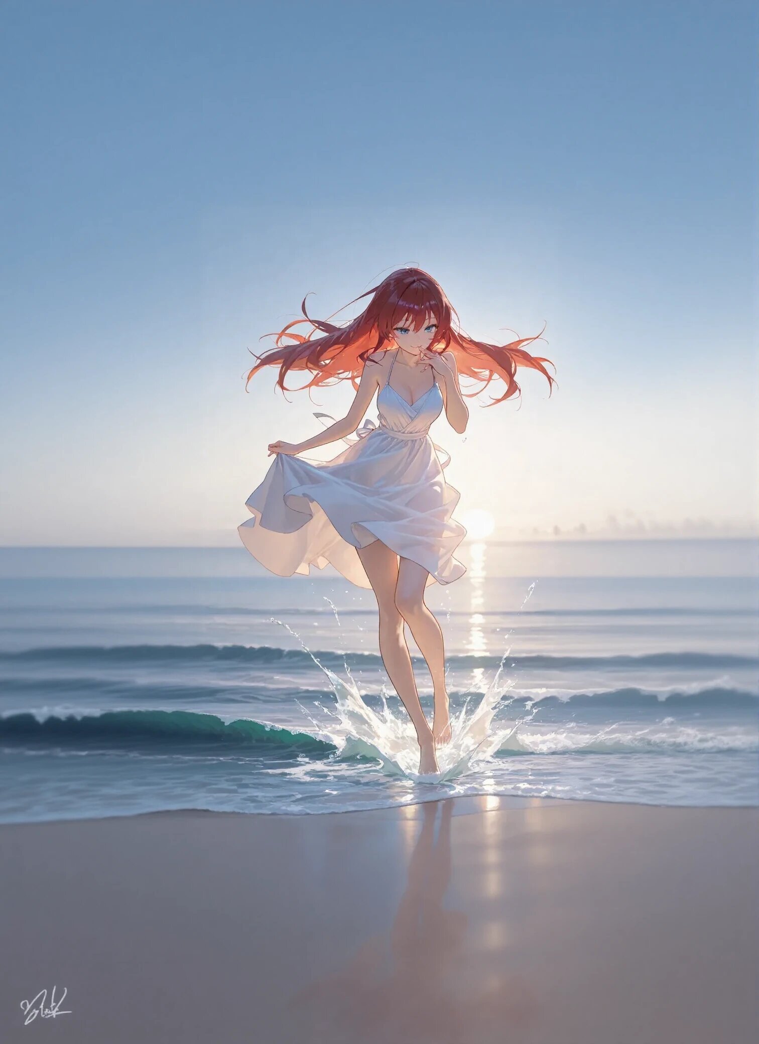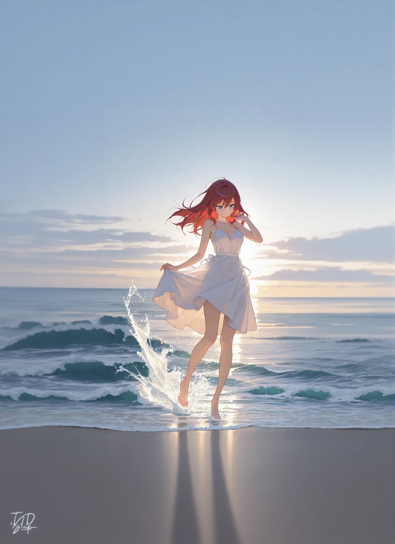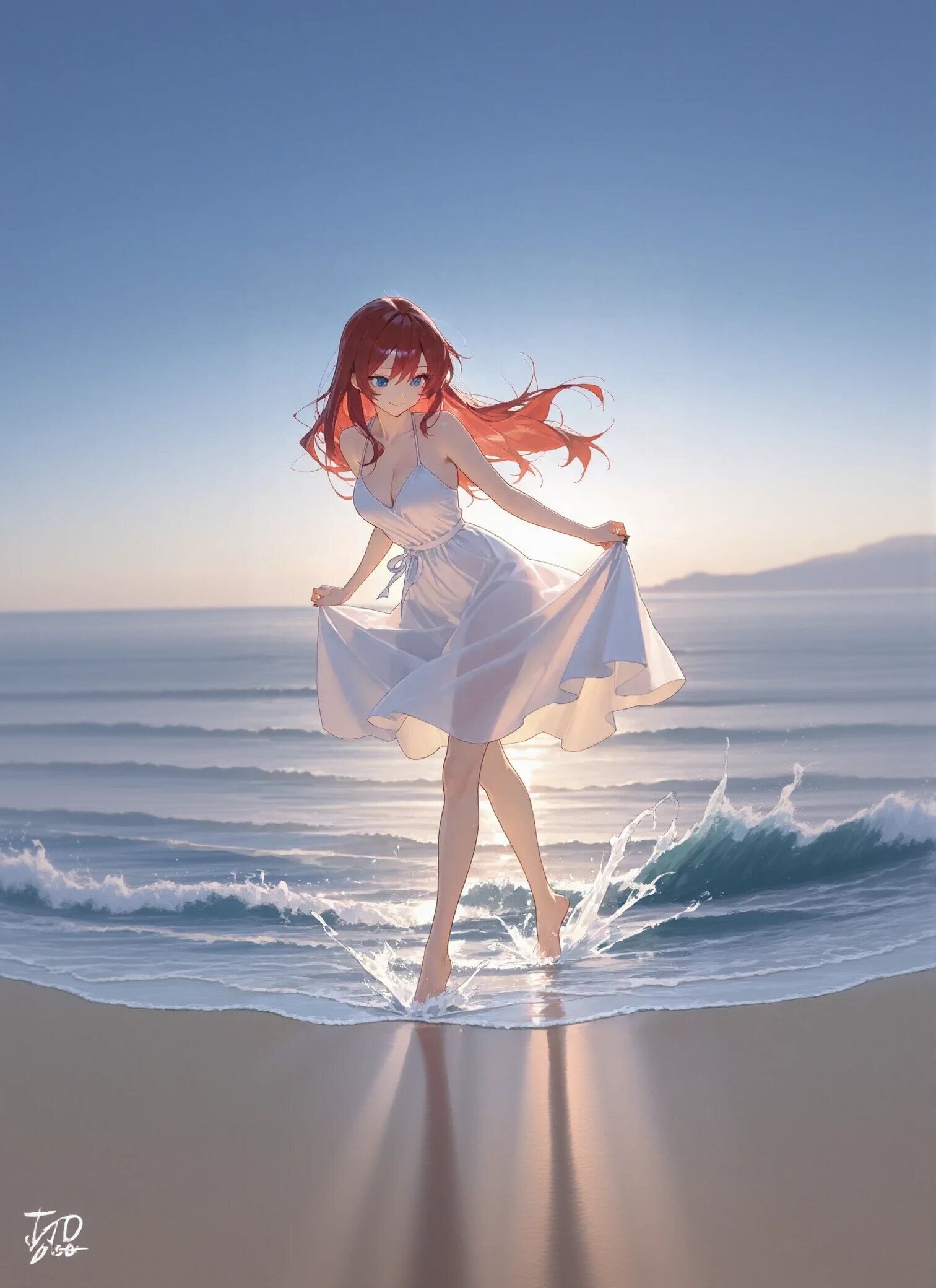 Masterpiece, high quality, great quality, high resolution, perfect lighting, very high resolution, full body view, score 9, score 8 and above, score 7 and above, based on an anime, tall, hourglass figure, beautiful face , beautiful long eyelashes, beautiful hands, delicate hands, grooming painted nails, beautiful female fingers, five fingers, super high detail, perfect anatomy, seaside, sandy beach, waves, white dress, bare feet, red hair, long, blue eyes, beautiful, beauty, beauty, Feet in the sea, skirts fluttering, smiles, hair fluttering, frolicking, splashing,