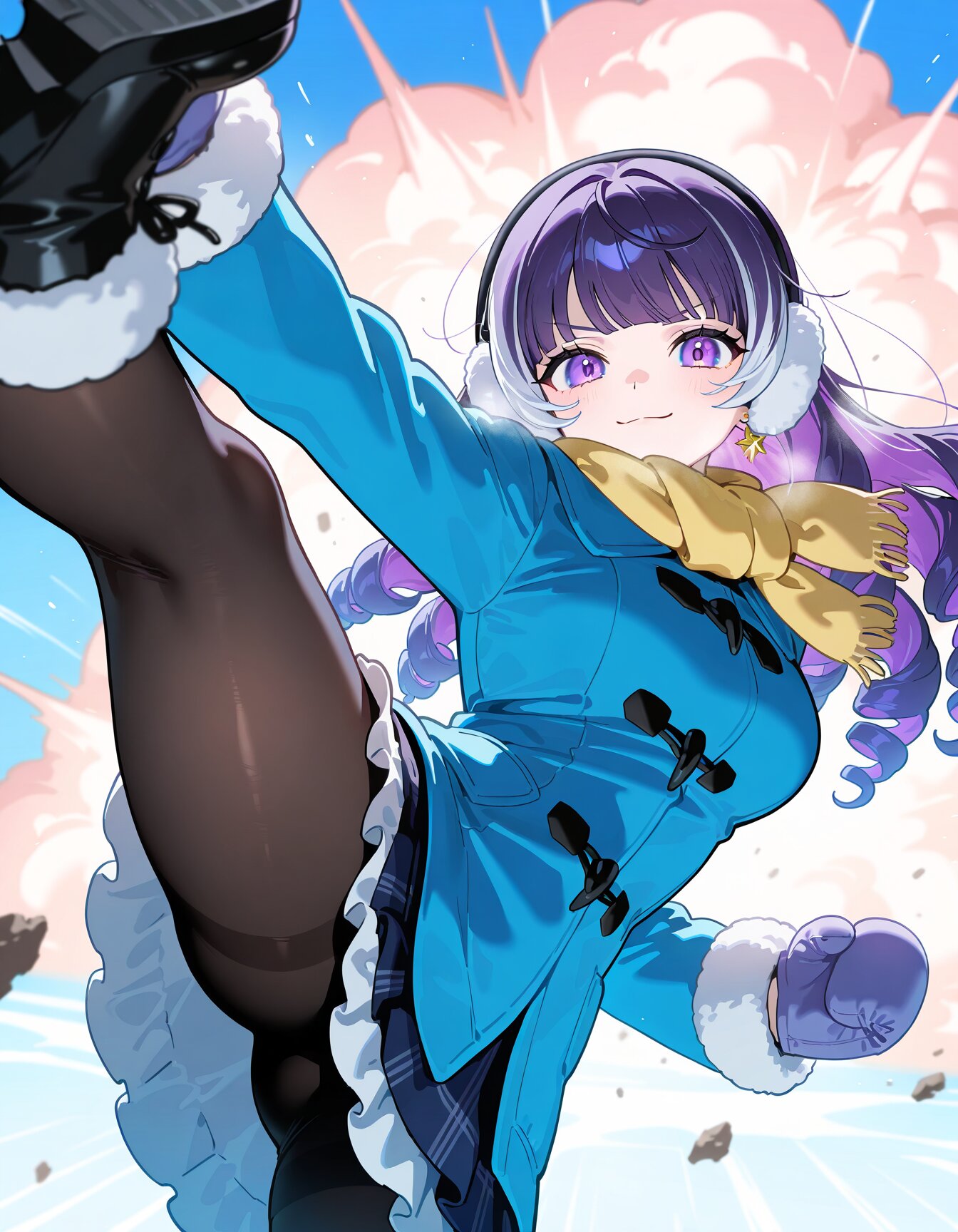 (close up:1.2) black border, looking at viewer,, in winter morning, 1girl, long hair, ringlets blunt bangs , shiny and strong hair, multicolored hair, pearl white hair, chartreuse yellow and ash rose and royal purple hair, 17yo, ,, beautiful lapislazuli eyes, first-rate female bodies perfect body beautiful medium breasts medium hips, skindentation, pantyhose, (muscular female:1.1) (wearing winter clothes, winter scarf, , mittens, pea coat:1.1), earmuffs , pale blue light blue boudoir coat, clean collared dress bow bow long petticoat skirt in pea coat, long sleeves, ankle boots wearing winter clothes, winter scarf, fur gloves, black inner, star earrings, sweater (respectful smile:1.0), winter atmosphere, winter sky, (gradient light pale blue background:1.0) light leak, glint, , (high kick, motion blur:1.0), leg up, , explosion, (motion lines:1.0), wind, debris, outstretched leg, masterpiece, best quality, amazing quality, very aesthetic, absurdres, professional art lots of details, , overexposure, shiny-glistening, (watercolor style:0.0), (pastel color style:0.0) <lora:noline (1):-0.6> <lora:sdxl2-flat2-512b:0.15> <lora:facelightup_xl_v10:0.5>