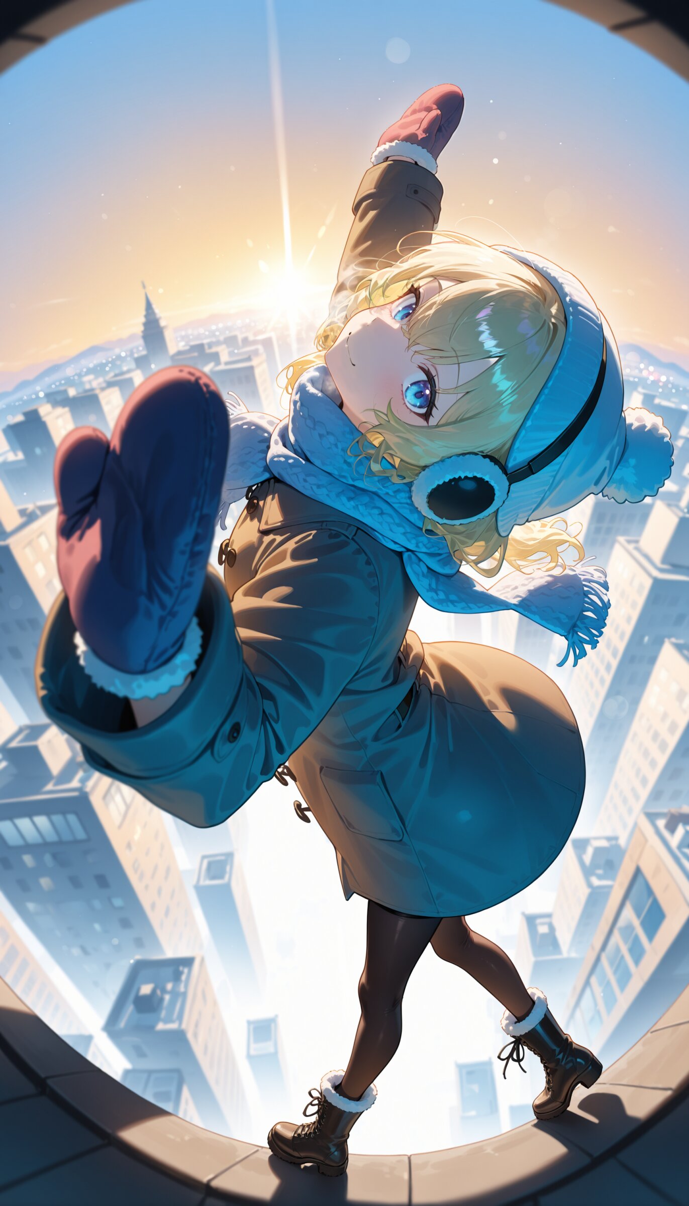 (close to viewer:1.2), knees out of frame from below, looking down dutch angle looking at viewer, 1girl, beautiful detailed eyes, cute face, cool, shiny skin, skindentation, beautiful vermilion eyes, , , jaune brillant hair, lapislazuli colored tips cute, prehensile hair, short bangs , shiny hair, first-rate female body perfect body beautiful huge breasts, wide hips,, warm comfy (seductive smile:1.0) ^_^ and :3, seductive smile (wearing winter clothes, winter scarf, enpera, mittens, trench coat:1.1), earmuffs winter hat, amber baggy moss green sundress frog cap in trench coat, long sleeves, pantyhose, cackle depth of field, bokeh, morning street, cityscape, , winter sunlight, morning, morning sunshine, direct lighting, paw pose, morning super fine concept art, hard surface, 8K, unreal engine, masterpiece, best quality, amazing quality, very aesthetic, absurdres you can add scenery, (volumetric lighting), To make the background more distinctive. professional art lots of details, , overexposure, shiny-glistening, (watercolor style:0.5), (pastel color style:0.0) <lora:noline (1):-0.5> <lora:sdxl2-flat2-512b:0.0> <lora:facelightup_xl_v10:0.5>