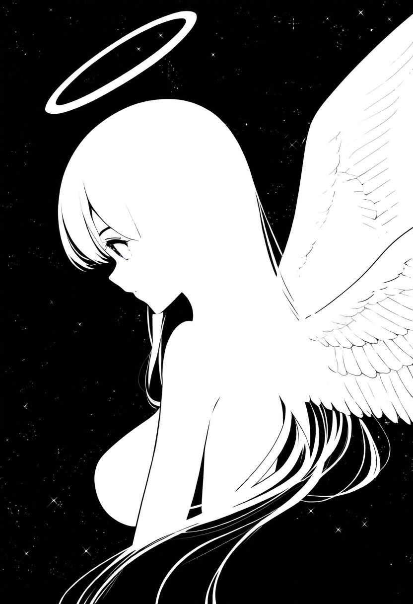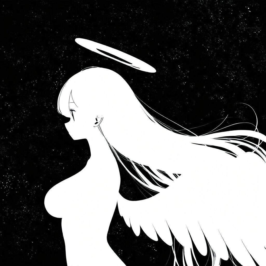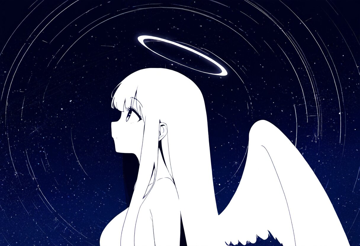 1girl, solo, {{{silhouette:1.4}}}, pale color, partically colored, monochrome two-tone, monochrome, very long hair, straight hair, large breasts, {{{angel wings, halo}}}, completely nude, {{{from side, profile}}}, {{{{portrait}}}}, starry sky background, simple background