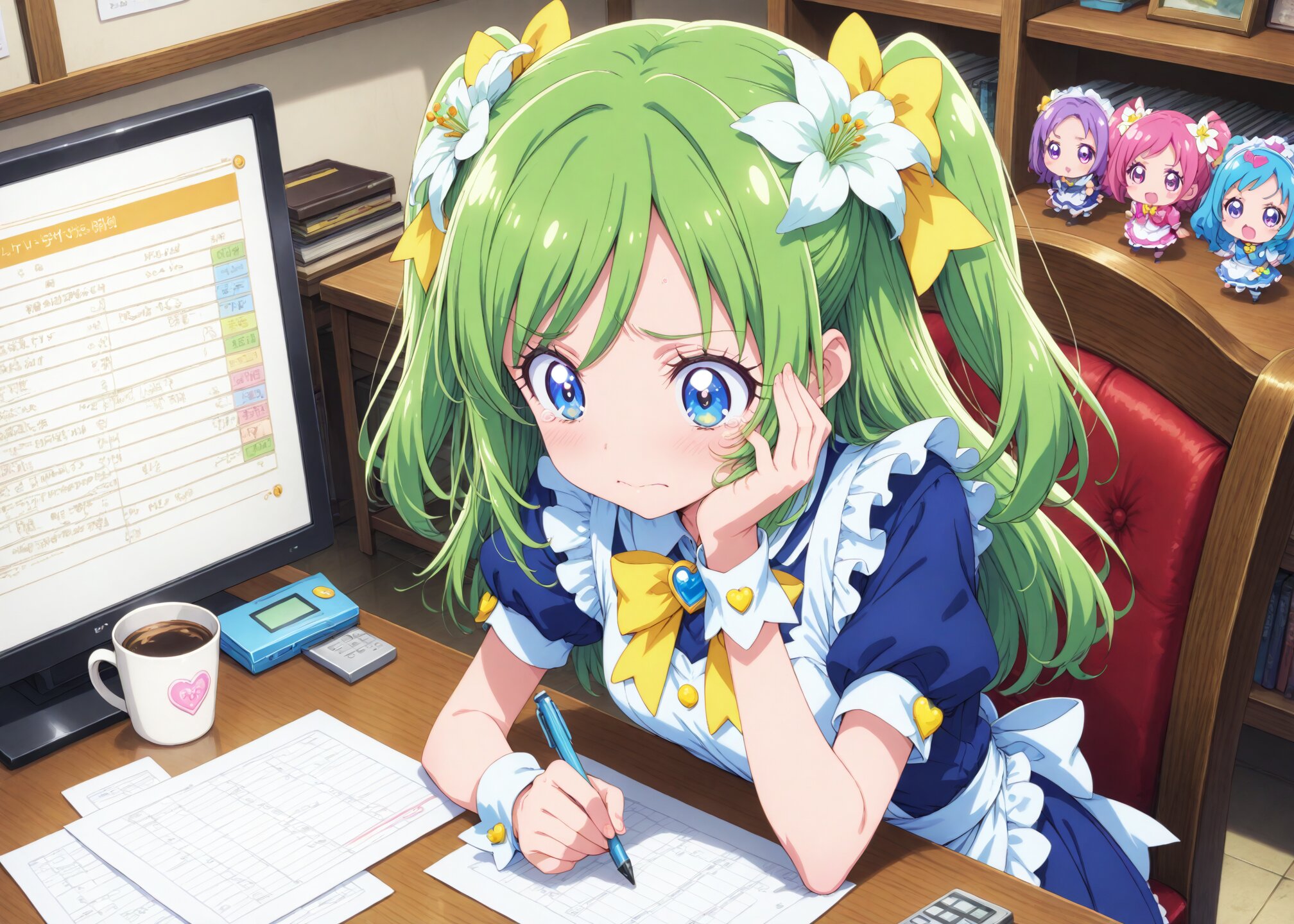 <lora:Nob10_ill_Pojiko_v1:1> 1girl, solo, teenage, masterpiece, best quality, pojiko, upper body, maid apron, calculator, note, holding pen, table, sitting, chair, cup of coffee, holding cup, tears, graph, chart, hand on face