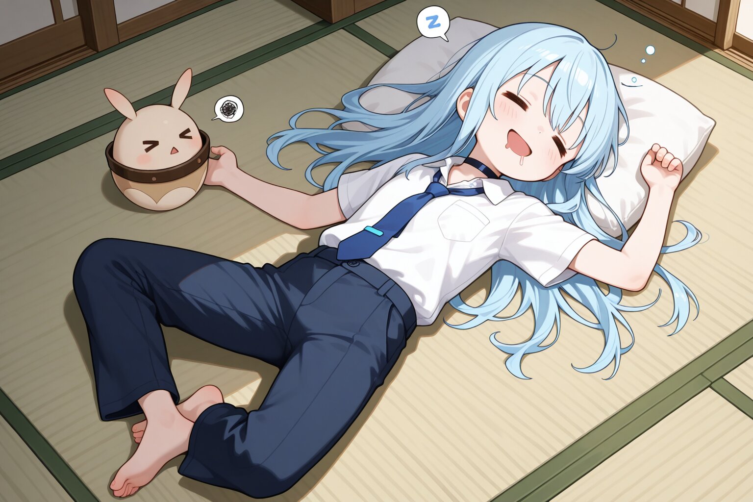 1 little girl, solo, full body, from above, masterpiece, best quality, amazing quality, very aesthetic, sky blue hair, long hair, straight hair, =_=, smile, cheerful, happy, chestnut mouth, sleeping, squeans, spoken zzz, zzz, saliva, choker, white shirt, open neck, opened blue tie, business pants, lying spread-eagle, messy sleeper, snoring, humpty dumpty, >_<, spoken squiggle, in japanese room, tatami,